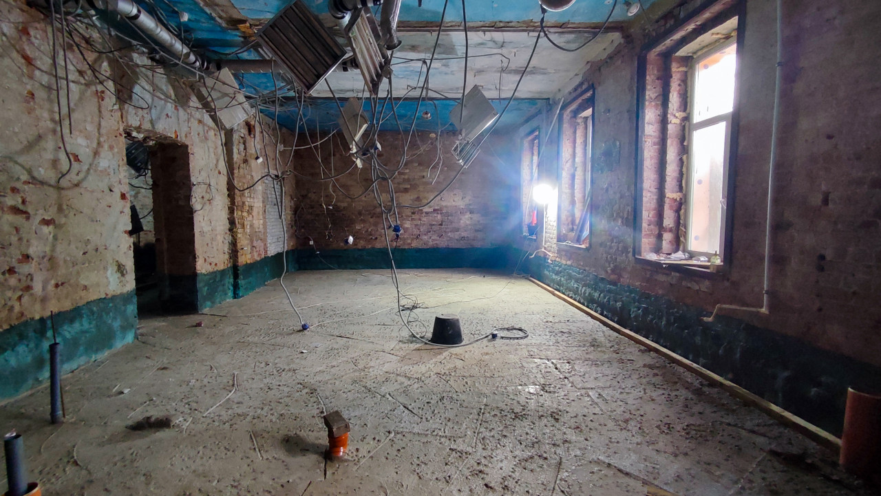 На фотографии показано помещение в кирпичном здании, находящееся на этапе капитального ремонта. На полу уложена черновая стяжка, стены очищены до кирпича, по периметру видна гидроизоляция. С потолка свисают кабели и осветительные панели, временно подвешенные для работы строителей. Через окна с пластиковыми рамами проникает естественный свет, частично закрытый строительной плёнкой. Снимок отражает процесс реконструкции старого здания, возможно, исторического или административного, где производится полная замена инженерных коммуникаций. Фото можно использовать в статьях о капитальном ремонте, реконструкции зданий, реставрации старинных построек и проектировании инженерных систем.