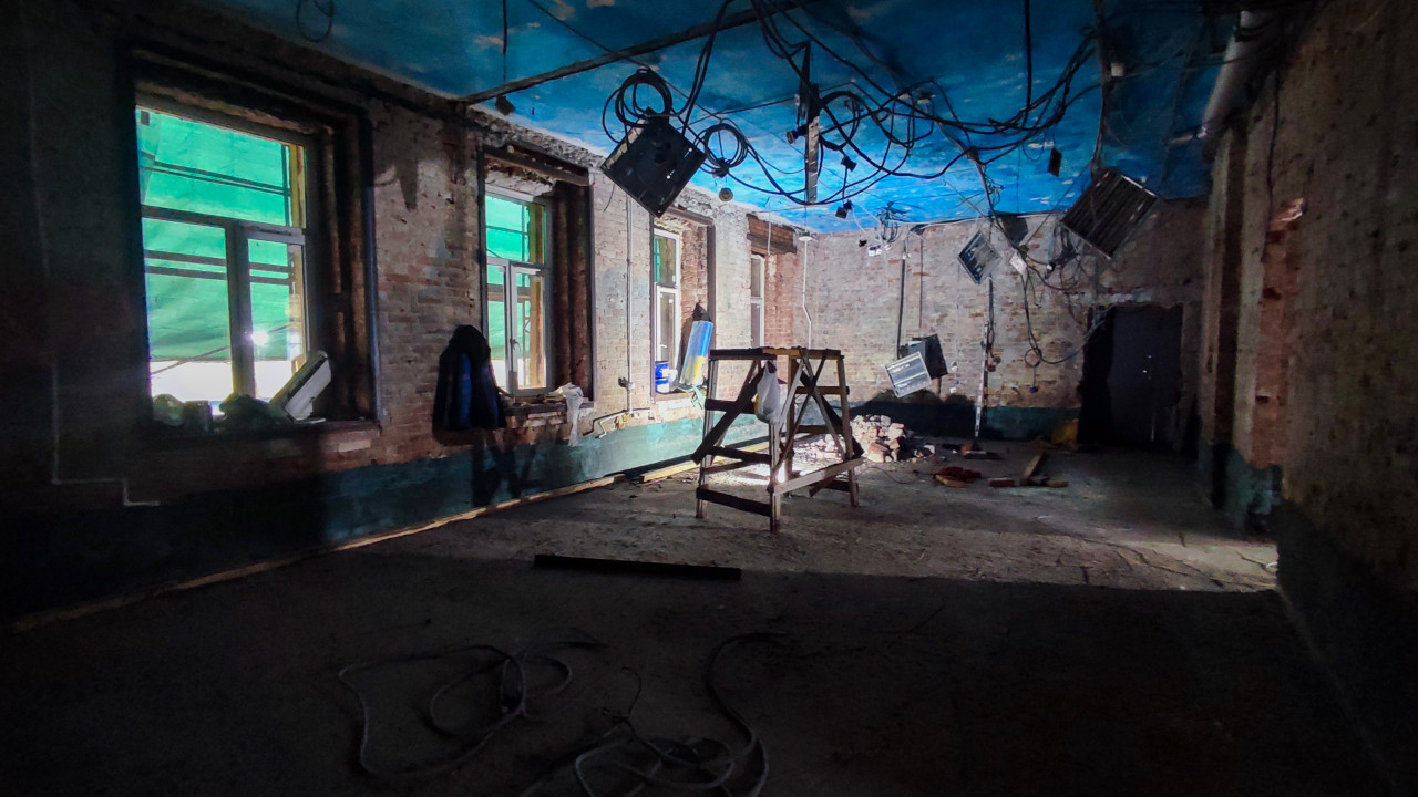 На изображении видно просторное помещение с кирпичными стенами, частично очищенными от старой штукатурки. Потолок окрашен в синий цвет, к нему подвешены осветительные панели и кабели временного электропитания. На полу видны следы черновой стяжки и строительные материалы. Через окна, прикрытые защитной плёнкой, поступает дневной свет. Объект находится на этапе реконструкции — здесь, вероятно, будет общественное или офисное пространство. Подобные помещения характерны для переоборудования зданий XIX–XX веков. Фото подходит для использования в материалах о строительных технологиях, инженерных системах, архитектурной реставрации и проектных решениях.