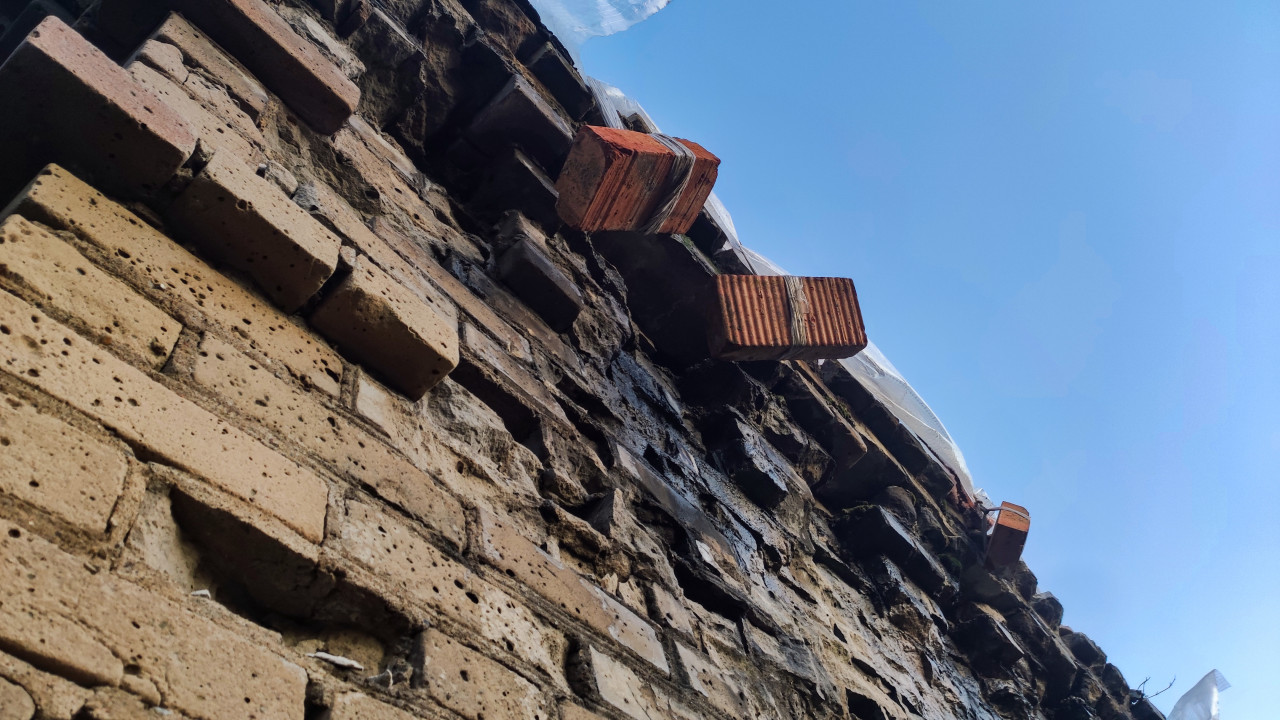На снимке показана сильно повреждённая стена из старого кирпича. Видны трещины, пустоты, следы вымывания раствора и обрушения фрагментов кладки. На верхней части стены лежат несколько красных кирпичей, закрепляющих прозрачную защитную плёнку. Съёмка выполнена снизу, что позволяет рассмотреть структуру и состояние кладки. На заднем плане — голубое небо и кроны деревьев. Изображение может использоваться в материалах по архитектурной экспертизе, техническому обследованию зданий, фотофиксации аварийных объектов и темам сохранения старинных построек.