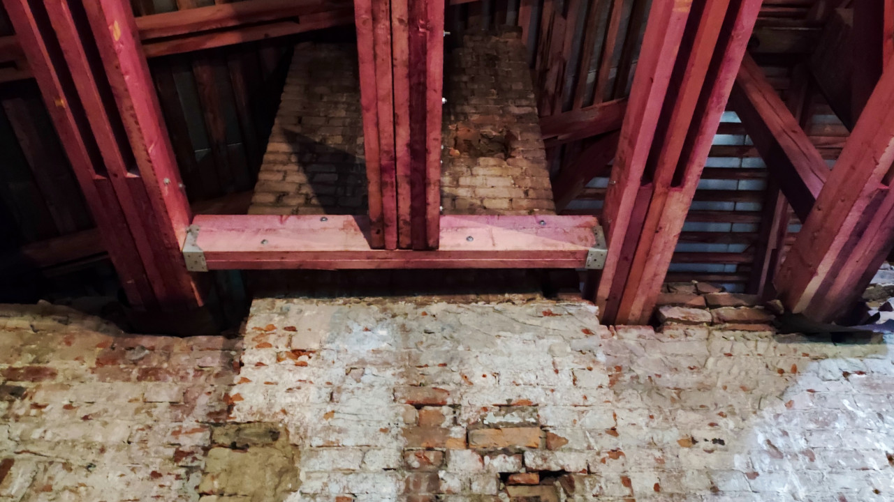 На фото виден фрагмент кирпичной стены старого здания, в которую вмонтированы новые деревянные стропила. Балки закреплены металлическими крепежами, обеспечивающими соединение несущих элементов. В верхней части конструкции заметны элементы кровельного перекрытия. Поверхность кирпичной кладки частично разрушена, что характерно для реставрационных работ. Снимок можно использовать в статьях о реконструкции зданий, ремонте кровельных систем и восстановлении архитектурных памятников.