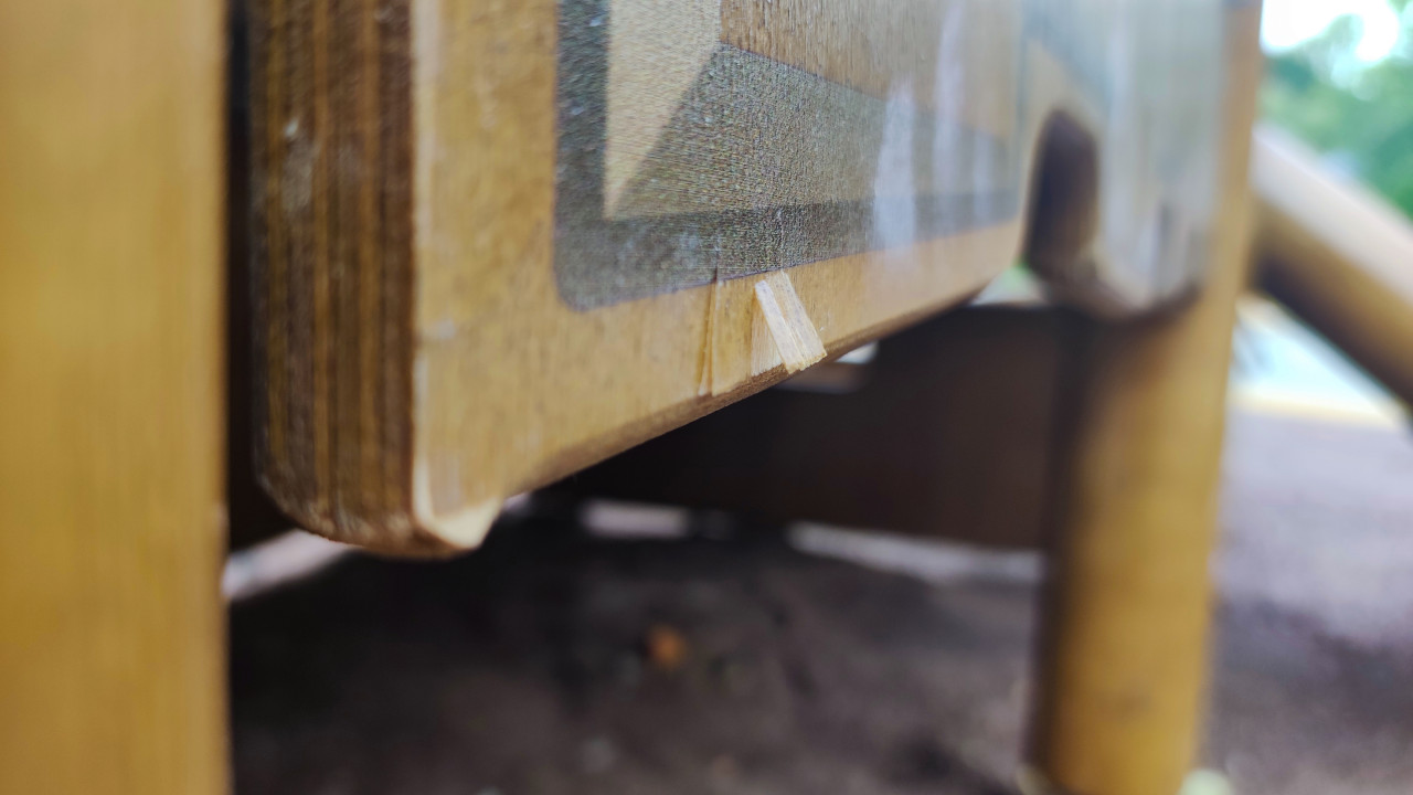 На фото крупным планом изображена нижняя часть деревянного элемента детского игрового комплекса, установленного на улице. Видны сколы и трещины на кромке фанерной панели, вероятно, вызванные механическими повреждениями или воздействием влаги. Конструкция выполнена из ламинированной фанеры с защитным покрытием, закреплена на деревянных стойках. Такое состояние может быть зафиксировано в ходе технической экспертизы или обследования безопасности детских площадок. Фотография подходит для использования в отчётах по контролю качества, строительных аудитах и материалах по эксплуатации малых архитектурных форм.
