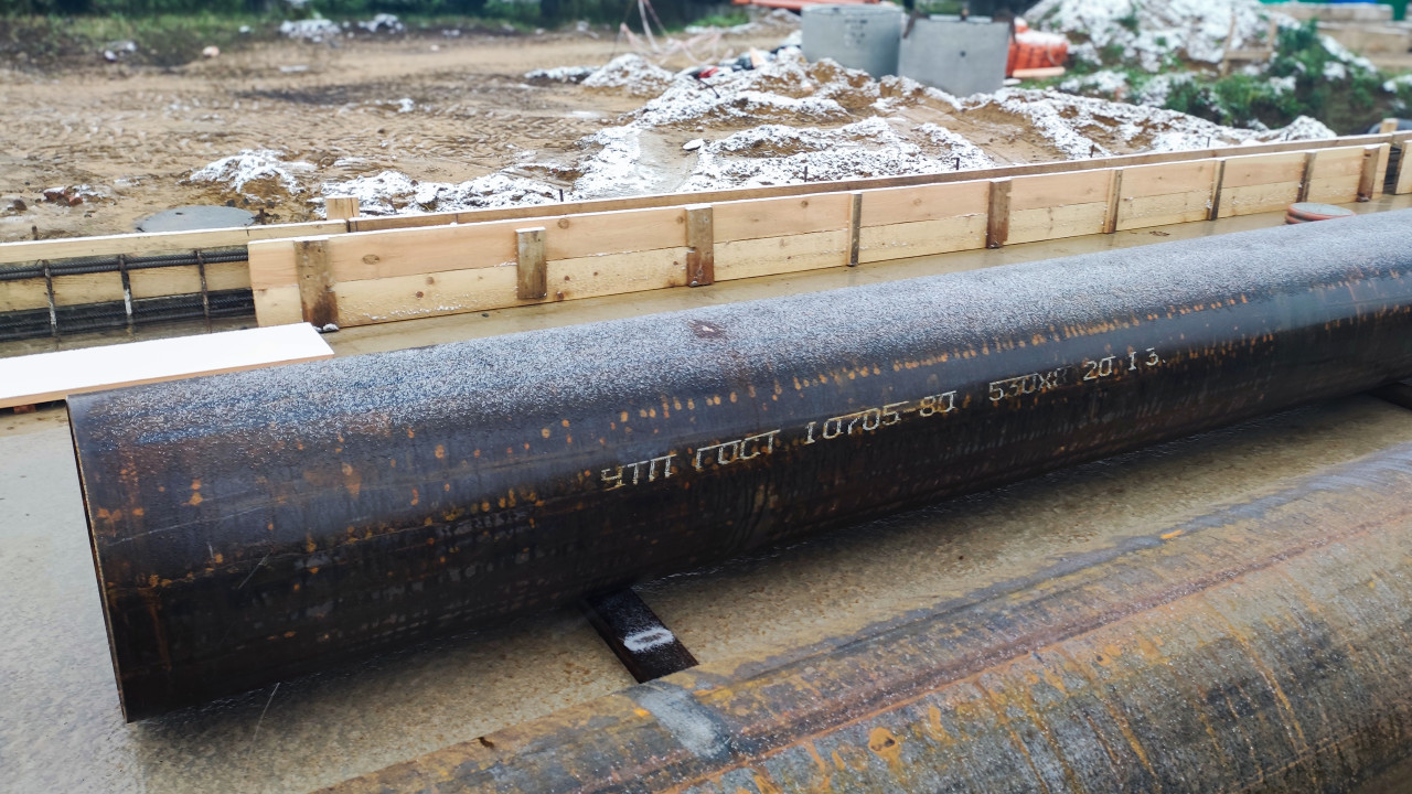 На фотографии запечатлен процесс подготовки стройплощадки к монтажу теплотрассы, где трубы размещены на фундаментной плите будущего помещения котельной. Стальные элементы уложены партиями на подкладки, что соответствует этапу временного складирования перед началом прокладки магистральных участков. На заднем плане различимы элементы строительной опалубки, металлические конструкции и временные ограждения. Видимое отсутствие изоляции на трубах свидетельствует о предстартовой фазе монтажа, когда выполняются замеры, разметка и планирование трассы. Снимок подходит для публикаций о строительстве тепловых узлов, инженерной подготовке и этапах возведения инфраструктурных объектов.