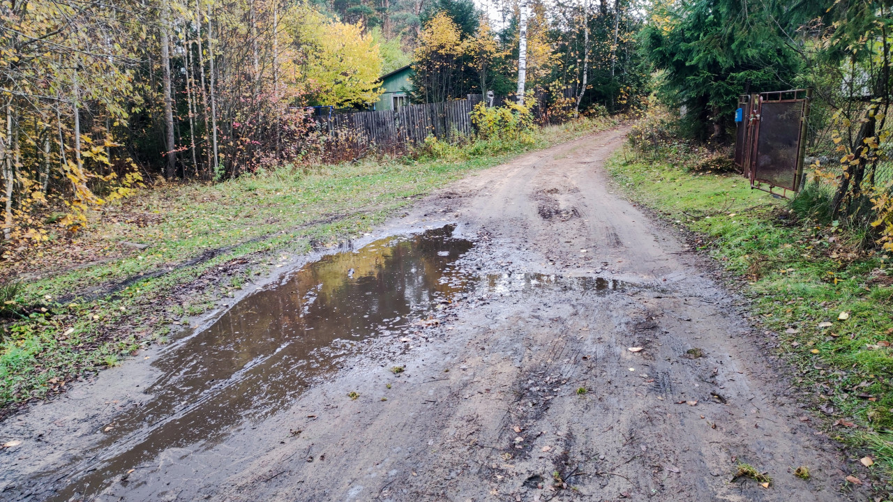 На фотографии изображена грунтовая дорога, частично размытая дождями, с крупной лужей на переднем плане. По обе стороны дороги растут березы, ели и кустарники с пожелтевшей листвой, указывающие на осенний сезон. На заднем плане виден деревянный забор и небольшое строение с зелёной крышей, предположительно дачный дом. Фотография передает типичный вид сельской дороги в Ленинградской области в межсезонье. Снимок можно использовать для иллюстрации тем, связанных с дорожным содержанием, дачной инфраструктурой, погодными условиями и сельской местностью.