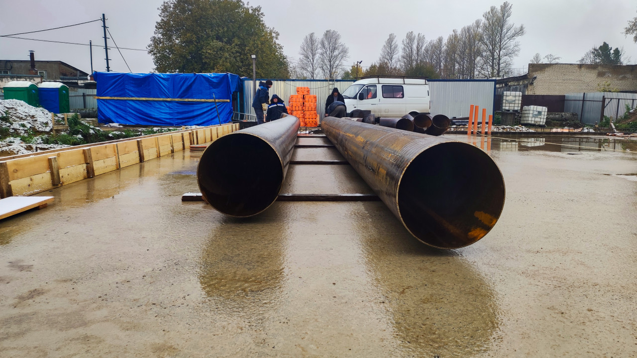 Складирование труб теплотрассы на плите перед монтажом котельной