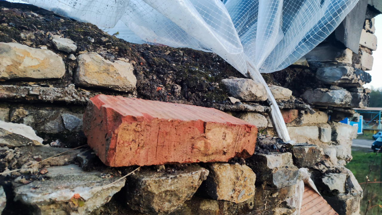 На изображении показан крупный план старой кладки из кирпича и камня, частично закрытой прозрачной плёнкой. На переднем плане лежит красный кирпич, на поверхности которого видны следы времени и трещины. Камни в основании стены имеют признаки разрушения, а между ними прорастают мох и лишайники. Съёмка передаёт текстуру материалов и состояние кладки. Фото подходит для использования в темах архитектурного обследования, строительных дефектов, реставрации исторических зданий и фотофиксации ветхих сооружений.
