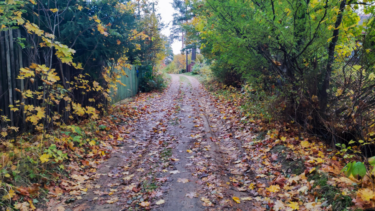 На снимке показана узкая грунтовая дорога, усыпанная опавшими листьями, ведущая вдоль заборов и густых зарослей. Слева видна зеленая изгородь, справа — кусты и деревья с пожелтевшей листвой. Осенняя атмосфера выражена мягким рассеянным светом и влажной землей после дождя. Дорога уходит в перспективу, что создает ощущение глубины кадра. Фотография может быть использована в материалах о загородной жизни, экологии, сезонных изменениях природы, инфраструктуре дачных поселков и пейзажной съемке.