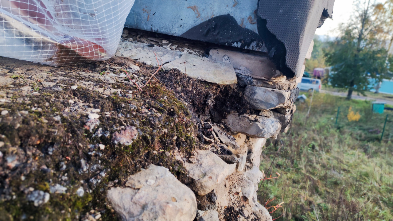 На фотографии показан фрагмент разрушенного кровельного узла старого строения, выполненного из камня и раствора. Видны следы выветривания, разрушение кладки и биопоражения в виде мха. Верхняя часть конструкции частично покрыта битумной гидроизоляцией и утеплителем. Такое состояние характерно для старых крыш с нарушенным водоотводом и отсутствием своевременного ремонта. Фото подходит для иллюстрации строительных дефектов кровли, обследования зданий и отчётов по техническому состоянию.