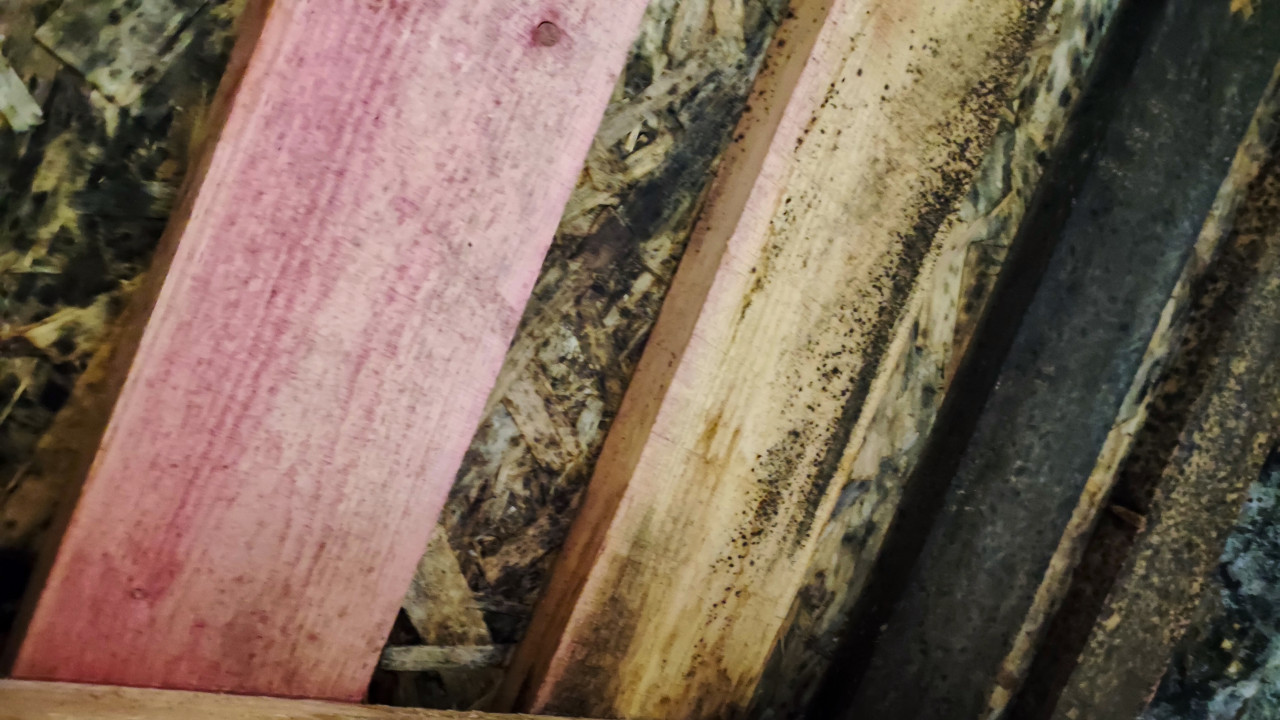 На фото изображён фрагмент поверхности деревянных досок и плит с признаками обработки и частичной окраски. Одна из досок имеет розоватый оттенок, другие покрыты следами влаги и загрязнений. Снимок отражает фактуру древесины и неоднородность поверхности, характерную для строительных материалов. Изображение может использоваться для тем, связанных с ремонтом, строительством, реставрацией или текстурами природных материалов.