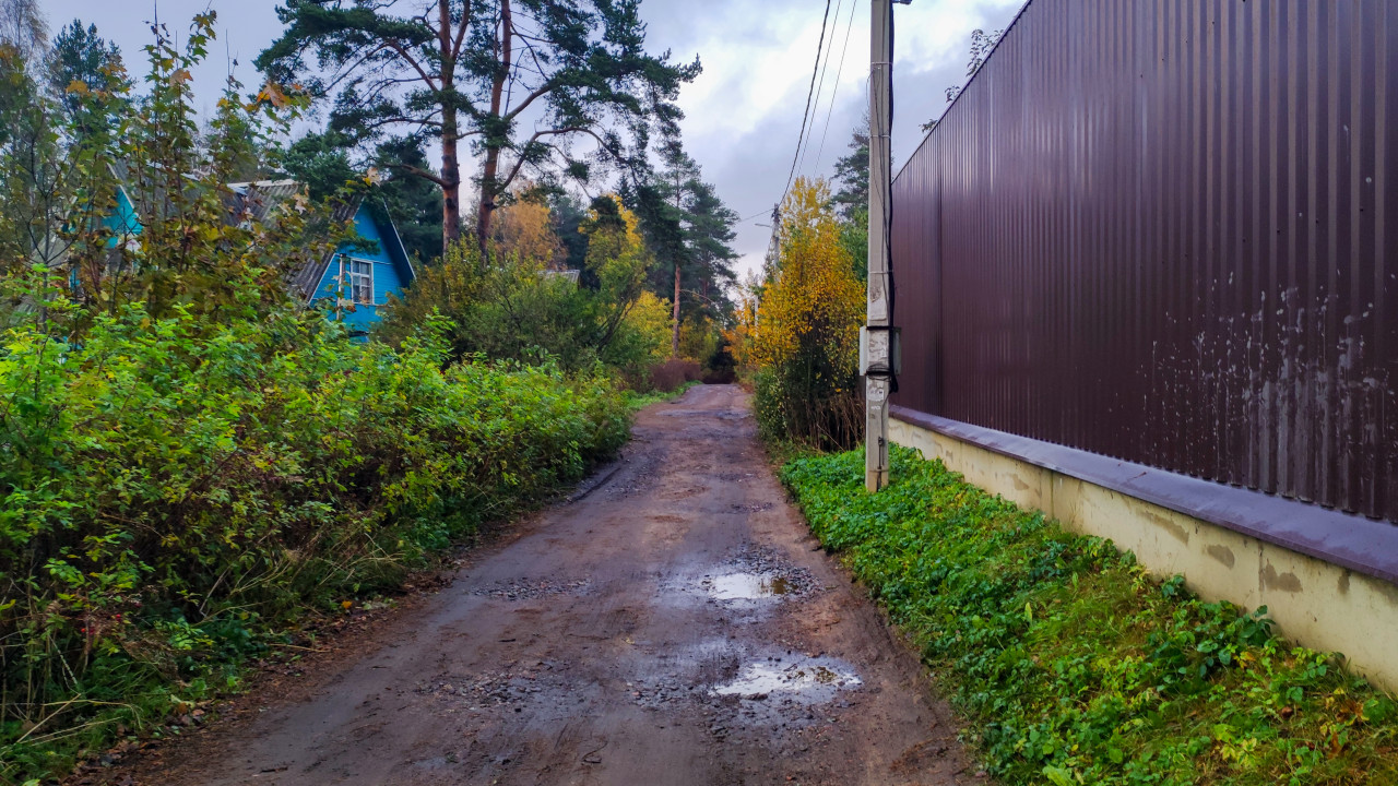 На фотографии изображена грунтовая дорога с лужами, идущая вдоль высокого коричневого забора. Слева виден деревянный дом с голубыми стенами и крышей, частично скрытый за кустарником. По обе стороны дороги растут кусты и деревья, среди которых заметны ели и лиственные породы. Над дорогой проходят провода на опоре. Атмосфера осеннего загородного поселка передает сочетание влажного воздуха, тишины и уединенности. Фото подойдет для использования в материалах об инфраструктуре, сельской архитектуре и пейзажной съемке.
