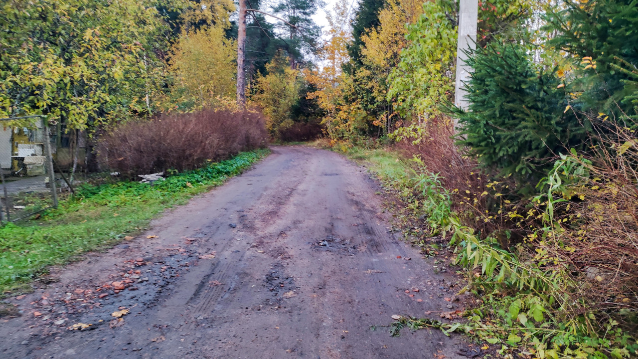 Фотография показывает извилистую дорогу, частично покрытую грязью и следами износа. По краям дороги растут кустарники, ель, лиственные деревья и небольшие участки травы. Слева виднеется участок с забором из металлической сетки и старой постройкой, справа проходит бетонный столб линии электропередачи. Осенние краски доминируют в пейзаже, создавая характерный вид загородного поселка в Ленинградской области. Снимок можно использовать в материалах об инфраструктуре, благоустройстве и сезонных изменениях сельских территорий.
