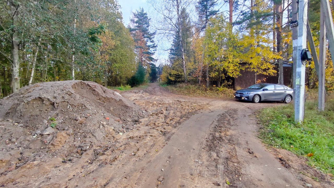 На фото изображено пересечение двух грунтовых дорог в лесопоселковой зоне. В центре кадра видны насыпи песка и глины, слева — деревья, справа — припаркованный легковой автомобиль у деревянного строения. Вдали дорога уходит в сторону леса. Осенняя растительность и влажная почва создают характерную атмосферу для окраин загородных поселков Ленинградской области. Снимок можно использовать для иллюстраций по темам транспортной инфраструктуры, благоустройства, дорожных работ и дачного быта.