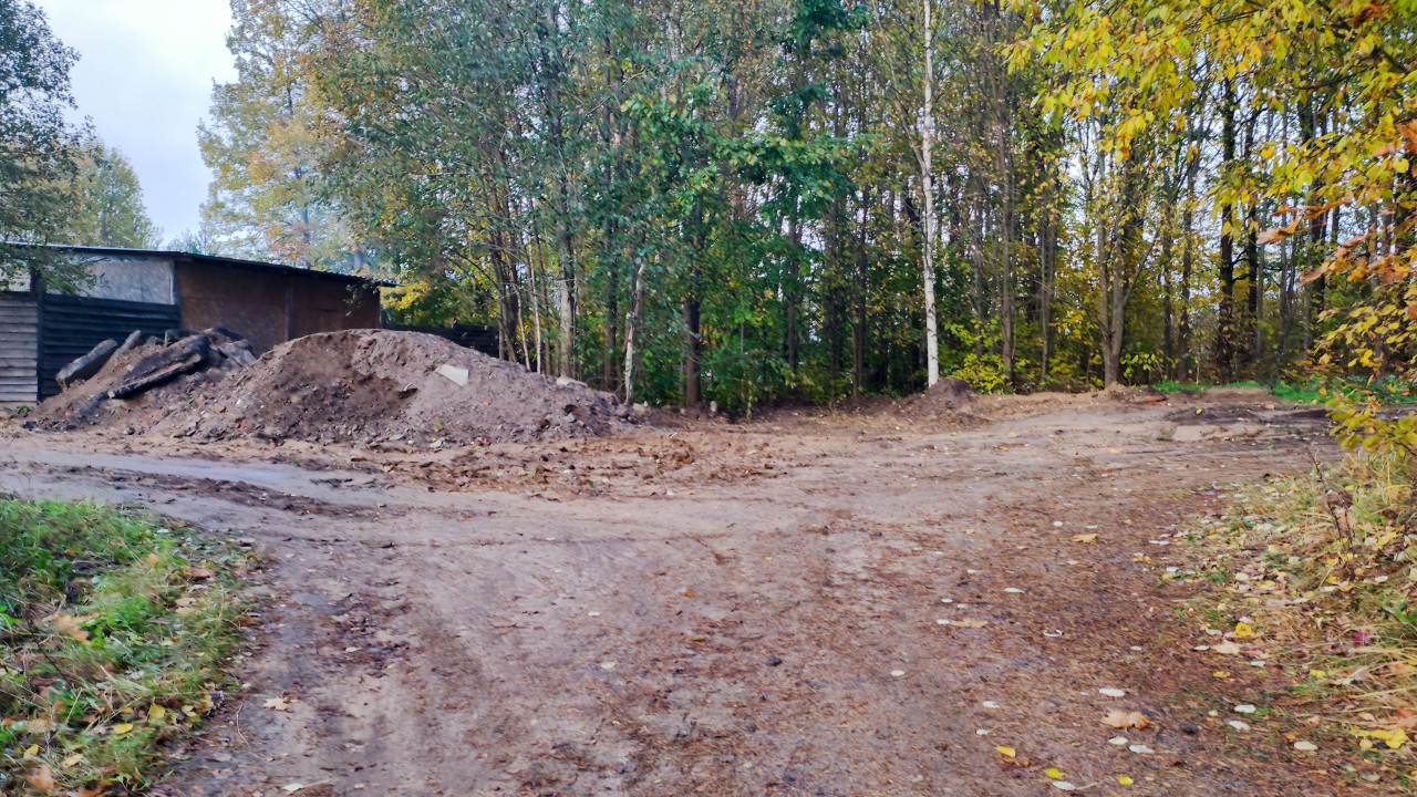Фотография показывает участок с насыпями песчано-глинистого грунта, расположенный у кромки леса. На заднем плане виден деревянный навес, а за ним густые деревья с осенней листвой. На земле заметны следы техники и остатки строительных материалов. Снимок отражает процесс благоустройства или подготовки площадки к строительным работам в загородной зоне. Фото можно использовать для тем, связанных с инженерной подготовкой, ландшафтными работами и утилизацией строительного грунта.