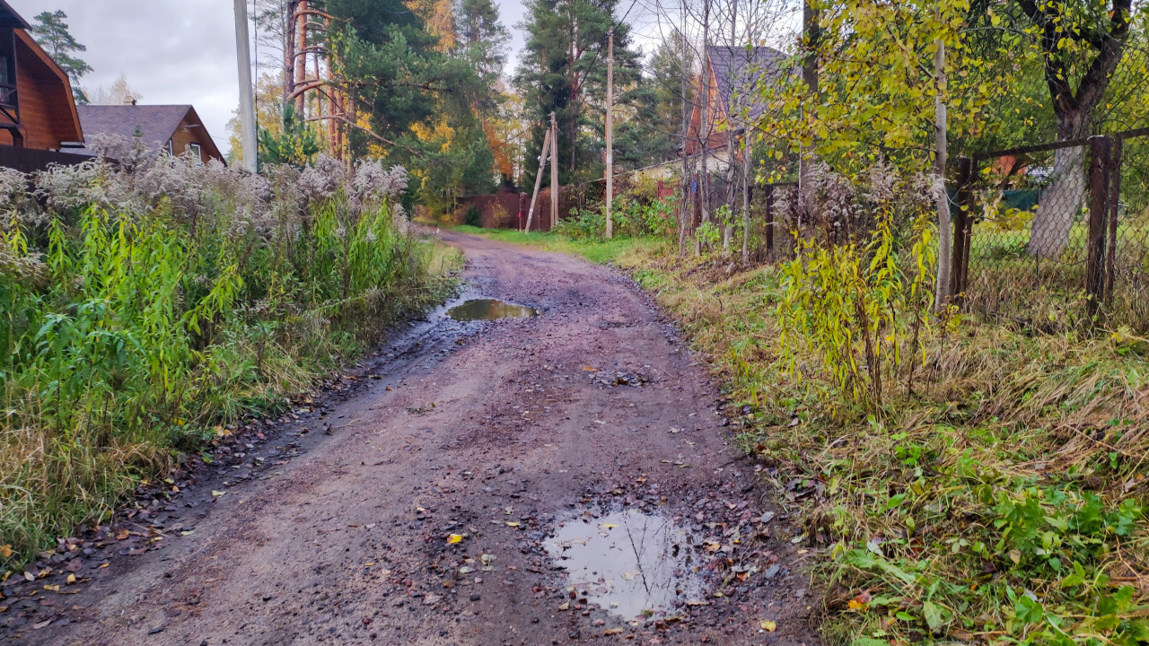 На фотографии изображена загородная дорога с грунтовым покрытием, на поверхности которой видны лужи после дождя. Слева и справа вдоль дороги расположены участки с заборами и растительностью. В кадре заметны деревянные дома с двускатными крышами, а также линии электропередачи и деревья с осенней листвой. Фотография передает типичный вид дачного поселка Ленинградской области в осенний период и может использоваться для иллюстрации тем, связанных с дорожной инфраструктурой, благоустройством и загородной жизнью.