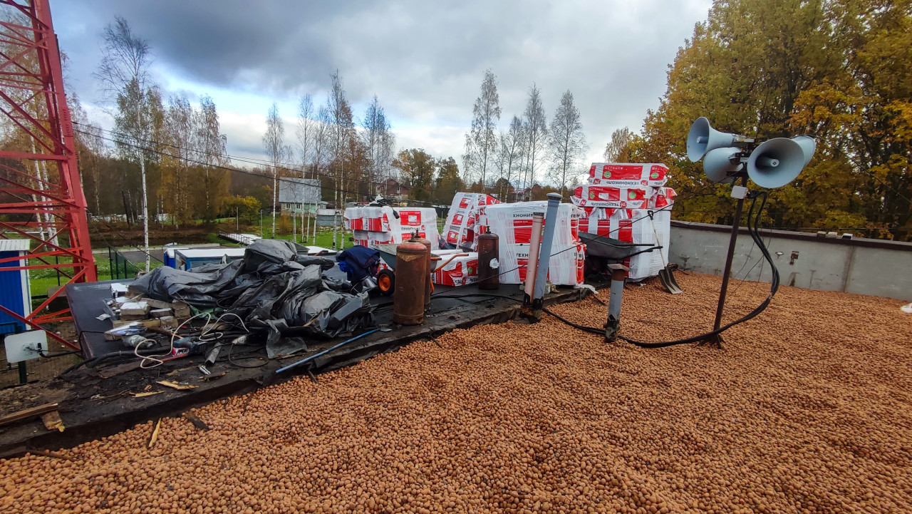 крыша ремонт крыши крыша здания износ кровельные работы ремонт кровли повреждения крыши кровля кровельное покрытие крыша дома строительство утеплитель ТЕХНОНИКОЛЬ складирование материалов плоская кровля подготовка монтажа оборудование на крыше громкоговоритель строительный инвентарь реконструкция крыши капитальный ремонт хранение утеплителя стройплощадка застройка теплоизоляция монтаж кровли система оповещения организация работ строительные материалы укладка кровли подготовительный этап транспортная упаковка инвентарь технология строительства наружные работы плоская крышаПохожие фотографии