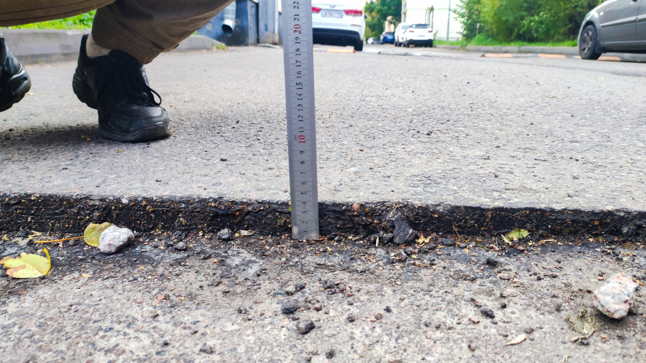 На фотографии показано измерение толщины слоя асфальта при помощи металлической линейки. На переднем плане видна кромка вырезанного участка дорожного полотна, на заднем — обувь специалиста и часть автомобиля. Снимок можно использовать для иллюстрации контроля качества дорожных работ, инженерных замеров и мониторинга состояния покрытия в городских условиях.