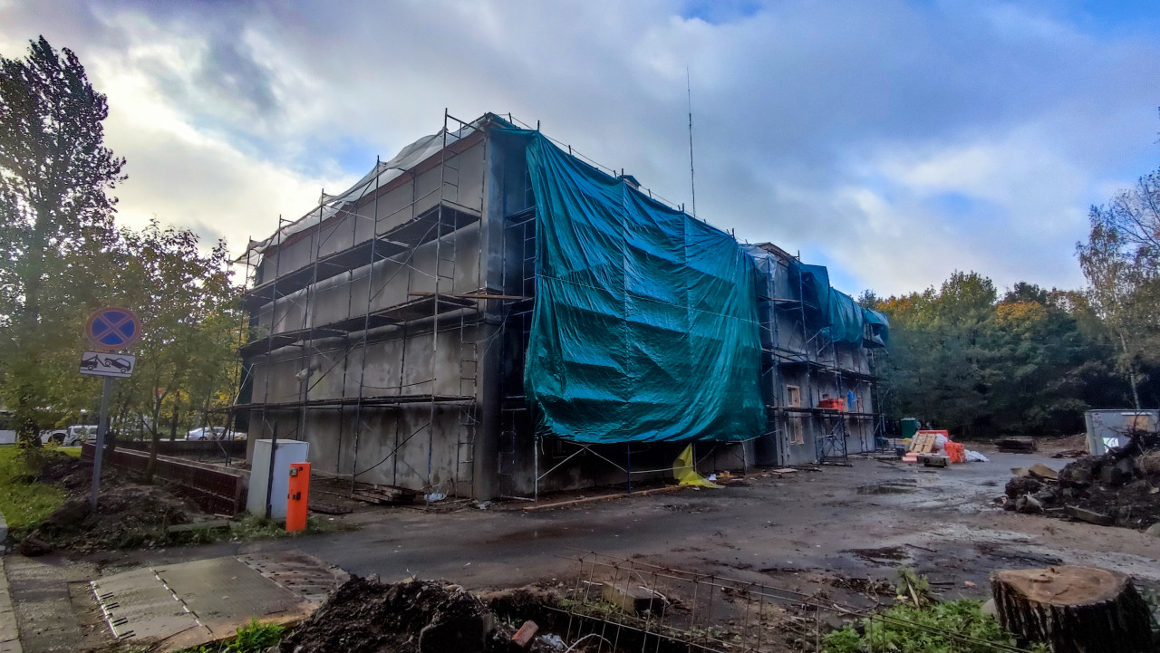 На снимке изображено здание, укрытое зелёным строительным тентом, с установленными металлическими лесами по периметру. Видны следы земляных работ, строительные материалы и временные ограждения. Это может быть капитальный ремонт или реконструкция общественного здания. Осенняя погода и влажный асфальт создают атмосферу рабочего процесса. Изображение подходит для материалов о строительстве, реставрации и инженерных работах в городской среде.