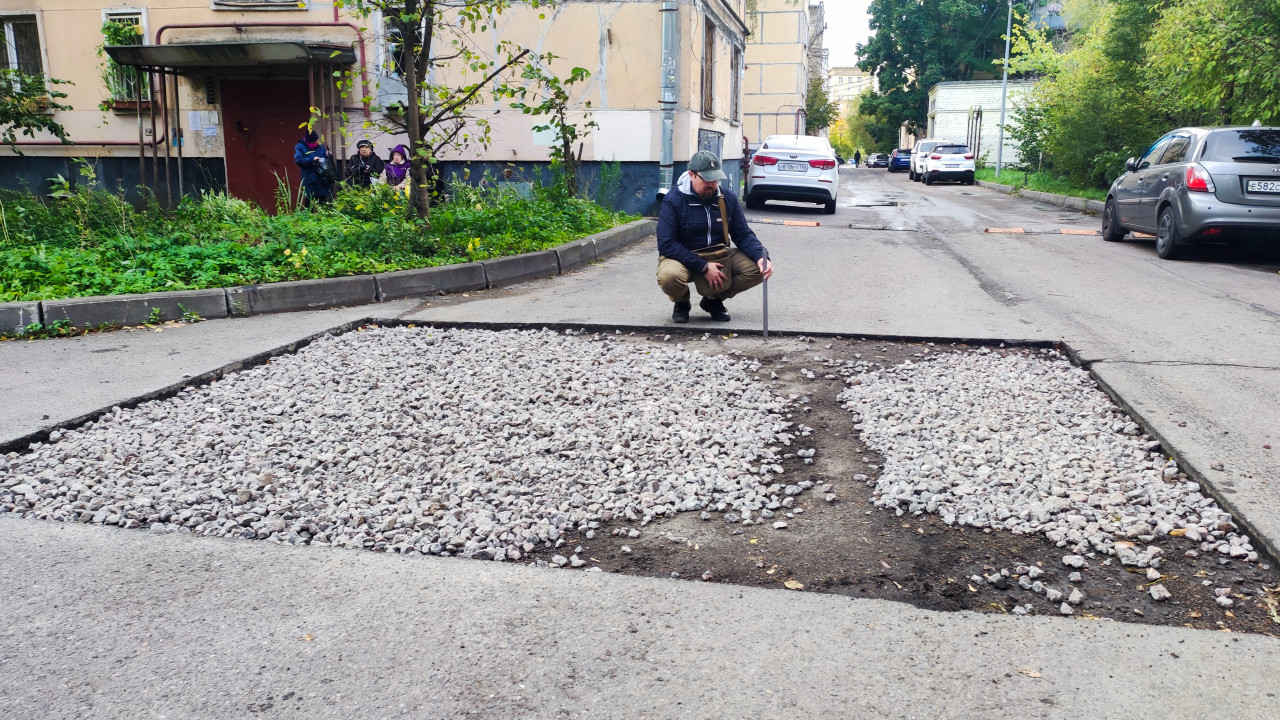 На снимке запечатлён специалист, проводящий осмотр участка дорожного покрытия, подготовленного под ремонт. В центре кадра — прямоугольный вырез в асфальте, заполненный щебнем. На фоне видны жилые дома и припаркованные автомобили. Фото отражает процесс контроля качества при проведении ремонтных работ и может использоваться для иллюстрации муниципальных проектов по благоустройству и ремонту внутридворовых проездов.