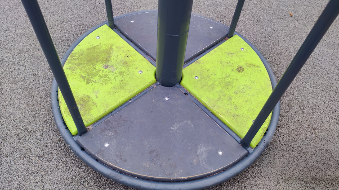 На снимке изображён элемент детской площадки — вращающееся игровое колесо с металлическими поручнями и платформой, разделённой на секции серого и салатового цветов. Установка расположена на участке с серым прорезиненным покрытием. На поверхности видны следы эксплуатации и загрязнения. Кадр фиксирует внешний вид оборудования для оценки состояния покрытия, прочности креплений и уровня износа. Фото подходит для использования в строительной и технической экспертизе объектов благоустройства.
