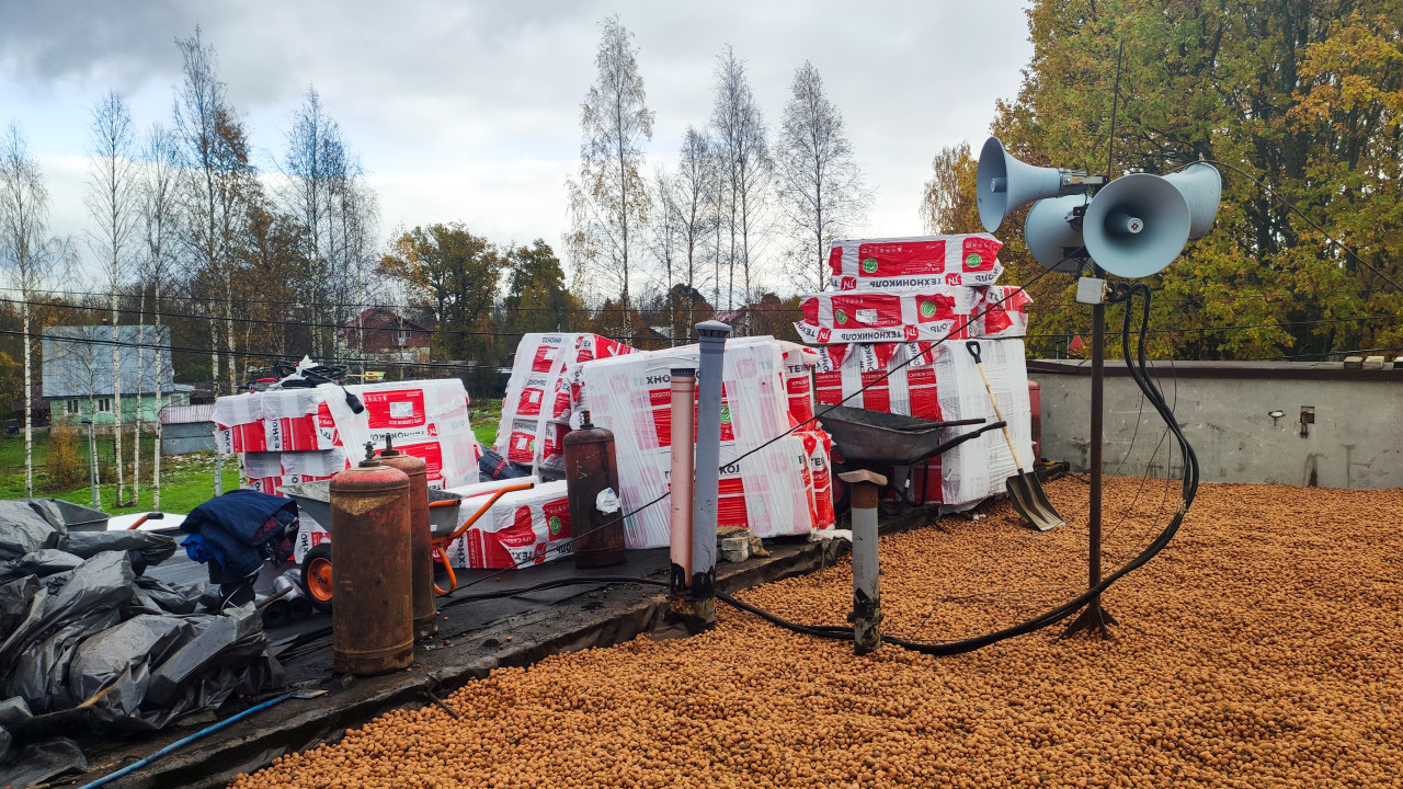 Складирование упаковок утеплителя и баллонов для кровельных работ