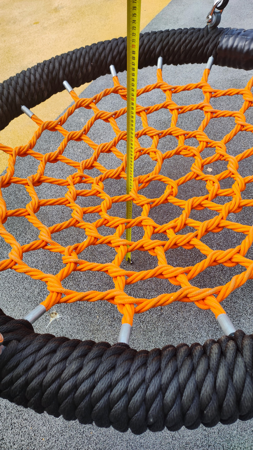 На фотографии показан процесс измерения высоты установки подвесного качеля в виде круглой «гнездовой» сетки. Центральная часть корзины выполнена из ярко-оранжевых переплетённых канатов, а обод — из толстого чёрного троса. В центр конструкции помещена рулетка, показывающая расстояние от поверхности покрытия до нижней точки качеля. Такие замеры используются при приёмке и проверке соответствия игрового оборудования стандартам безопасности. Фон фотографии включает резиновое покрытие детской площадки и элементы игровой зоны. Снимок подходит для статей о техническом надзоре, стандартах монтажа и контроле качества оборудования.