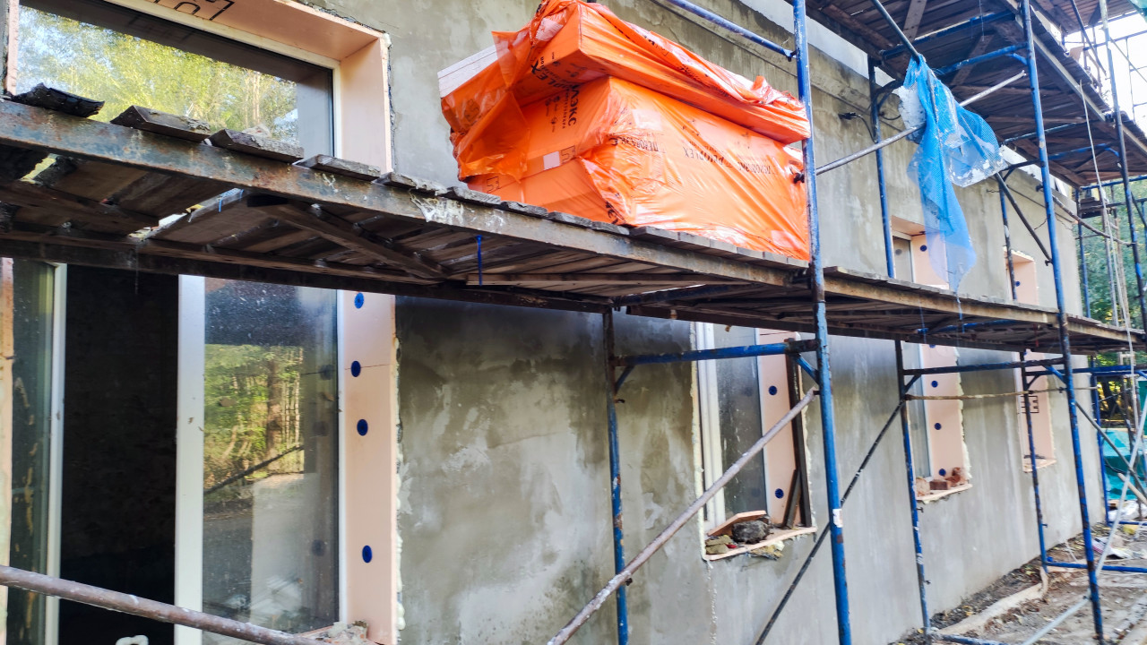 На снимке показан фасад строящегося здания с установленными строительными лесами. Видны окна с частично закреплёнными теплоизоляционными плитами, а на лесах размещены упаковки утеплителя в ярко-оранжевой плёнке. Часть стен оштукатурена, остальные участки готовятся к нанесению внешнего покрытия. В нижней части кадра — остатки стройматериалов, бруски, сетка и следы от монтажных работ. Снимок отражает процесс утепления фасада и может быть использован для публикаций о строительных технологиях и энергоэффективности зданий.