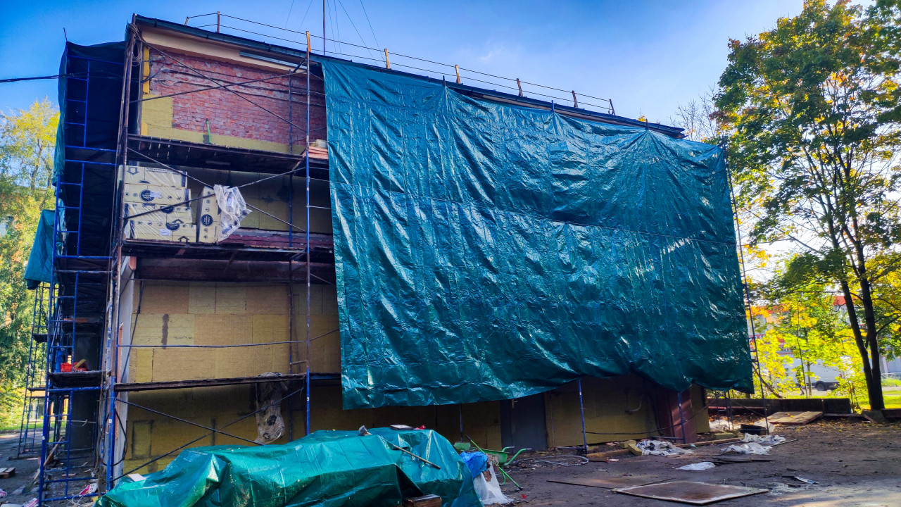 На фотографии изображён торец кирпичного здания, находящегося в процессе реконструкции. На стенах закреплены плиты утеплителя, а часть фасада закрыта зелёным строительным тентом. По периметру установлены металлические леса, на которых лежат упаковки теплоизоляционных материалов. На земле — строительный мусор и остатки плёнки. На заднем плане видны деревья с осенней листвой и голубое небо. Снимок демонстрирует технологию утепления и облицовки фасадов в процессе капитального ремонта.