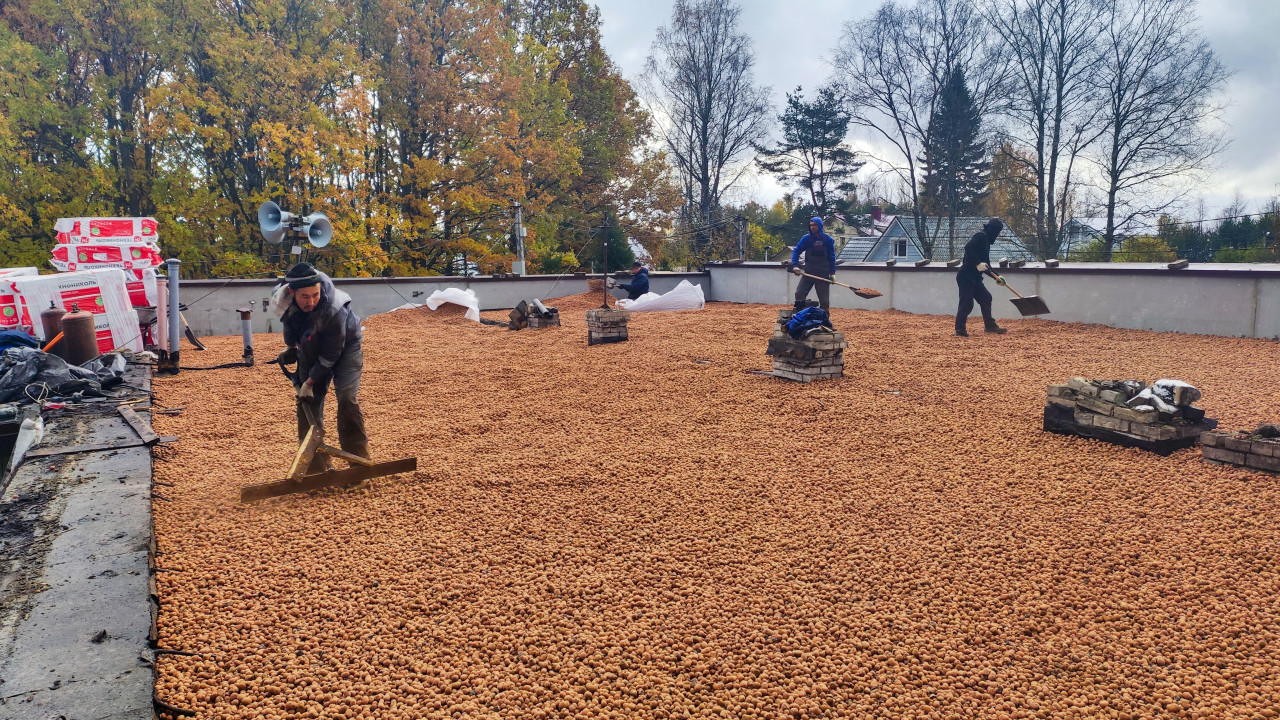 Рабочие распределяют керамзитовый гравий на плоской кровле