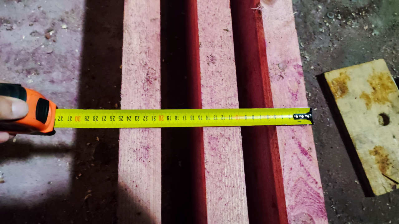 На снимке запечатлён процесс измерения ширины деревянной балки при помощи рулетки. Шкала показывает около 30 сантиметров, что соответствует размеру пиломатериала, предназначенного для несущих элементов перекрытия или опорных конструкций. Балки окрашены в защитный красноватый цвет, указывающий на антисептическую обработку. На фоне виден бетонный пол и строительный инвентарь. Фото может использоваться для иллюстрации строительных измерений, плотницких работ и контроля геометрии материалов.