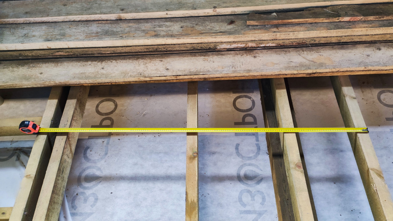 На фотографии показана рулетка, растянутая между деревянными лагами пола в строящемся каркасном доме. Замер производится для контроля шага лаг перед монтажом утеплителя и настила. На заднем плане видны пиломатериалы, лежащие на конструкции. Такое измерение необходимо для соблюдения проектных размеров и равномерного распределения нагрузки на пол. Снимок можно использовать в статьях и инструкциях по строительству, ремонту и монтажу деревянных полов.