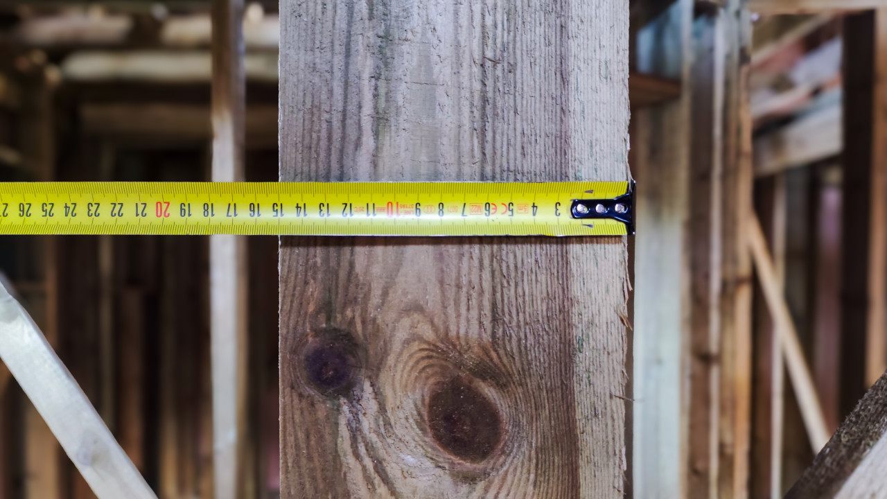 На фотографии крупным планом изображена рулетка, приложенная к деревянной стойке внутри строящегося каркасного дома. На ленте видно измерение ширины около 20 см. Фон состоит из деревянных элементов каркаса и диагональных укосин. Снимок демонстрирует процесс замеров при строительстве и может использоваться для обучающих материалов или технических публикаций.