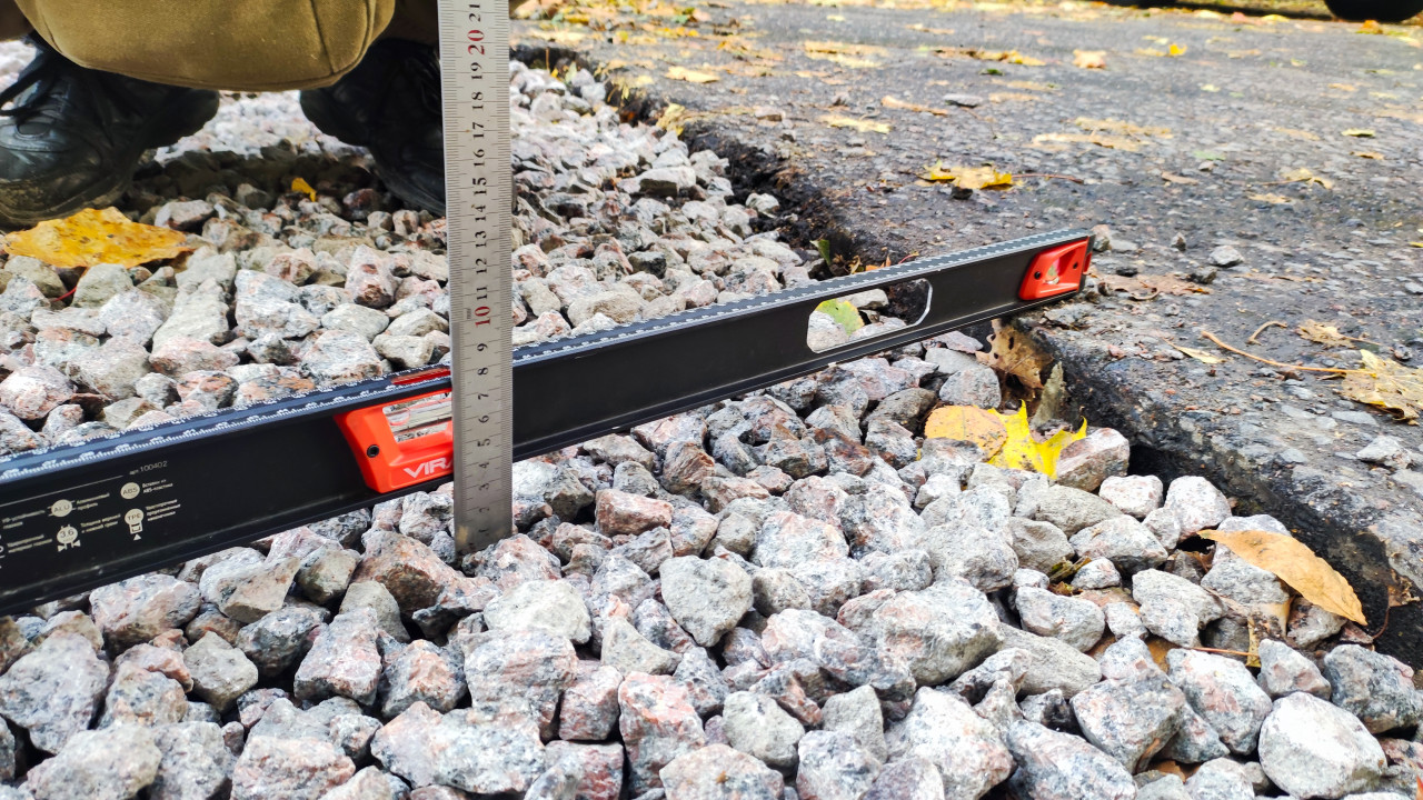 Замер расстояния от щебня до кромки асфальта с использованием уровня