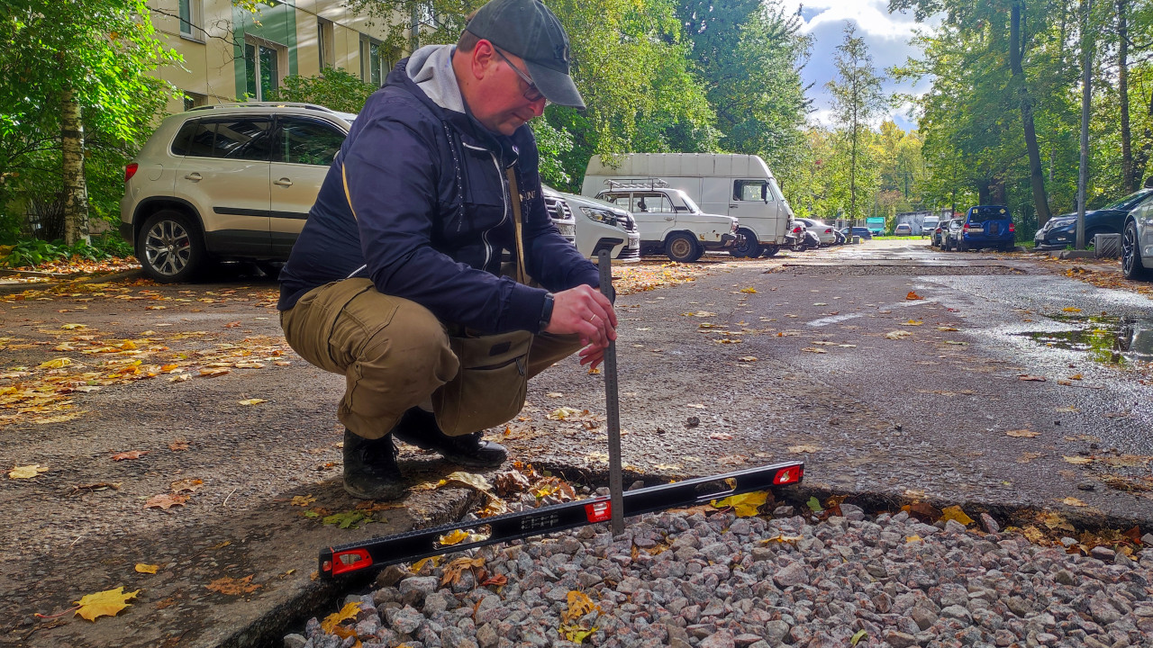 На фотографии изображён инженер, измеряющий толщину щебёночного слоя при помощи металлической линейки и уровня. Действие происходит на внутридворовой дороге среди жилых домов, окружённых деревьями. На заднем плане видны автомобили и зелёные насаждения. Снимок демонстрирует этап проверки соответствия толщины основания нормативам и может использоваться в публикациях о контроле дорожного строительства и благоустройстве территорий.