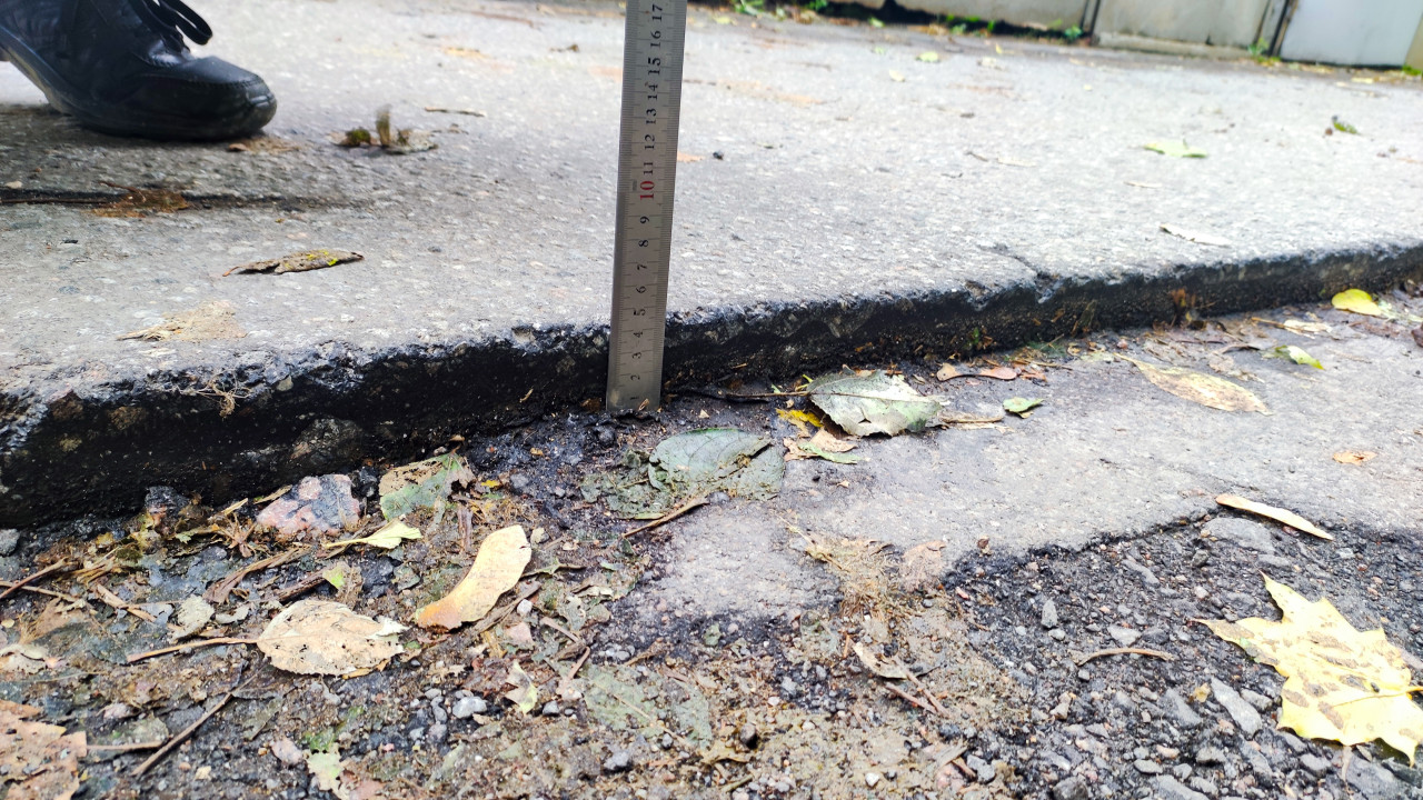 Измерение высоты кромки асфальта металлической линейкой