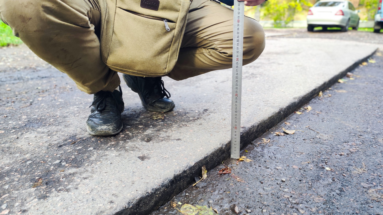 Проверка перепада высот между слоями асфальта на участке ремонта