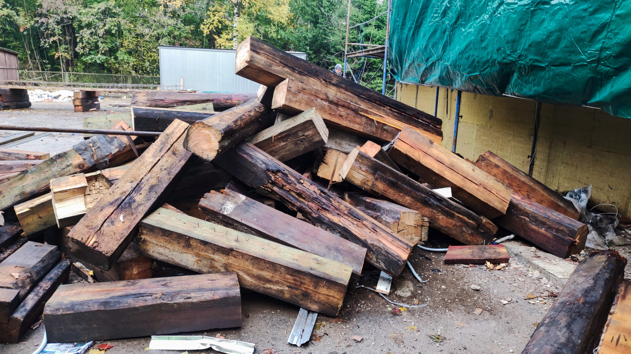 На снимке изображена куча старых деревянных балок, сложенных у стены здания, укрытого зелёным строительным тентом. Балки имеют следы износа, потемнение и трещины, что указывает на их многолетнюю эксплуатацию. На заднем плане виден участок строительной площадки с временными постройками и лесом. Снимок отражает этап демонтажа конструкций и может использоваться для иллюстрации утилизации материалов, реконструкции и строительных процессов на объектах исторического типа.