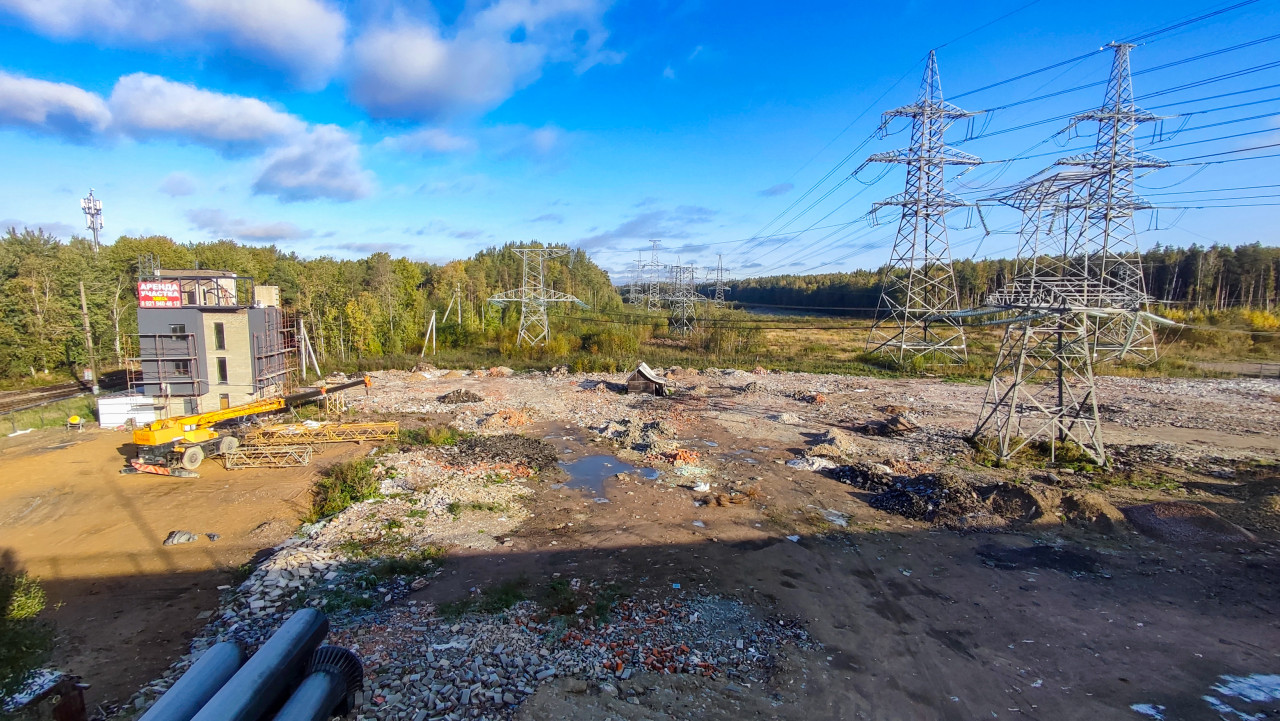 На снимке запечатлена строительная площадка на окраине города с линиями электропередачи, проходящими над открытой территорией. В кадре видно недостроенное здание с вывеской «Аренда участка», строительный автокран и металлические фермы. На земле разбросаны остатки кирпича и строительного мусора, присутствуют следы техники. На заднем плане — лес и поле с высоковольтными опорами. Фотография отражает сочетание инженерной и природной среды и подходит для использования в статьях о строительстве, энергетике и развитии инфраструктуры.