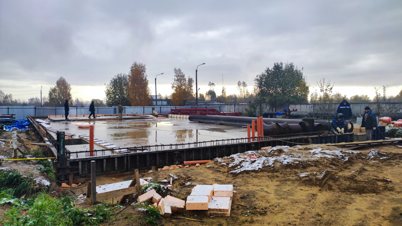 На фотографии изображена строительная площадка на этапе устройства фундаментной плиты. Поверхность основания покрыта водой после осадков, по периметру установлена опалубка и размещена арматура. На участке присутствуют рабочие и строительные материалы, включая трубы и утеплители. На фоне — ограждение территории и деревья. Изображение подходит для иллюстрации ранних этапов строительства зданий и инженерной подготовки основания.