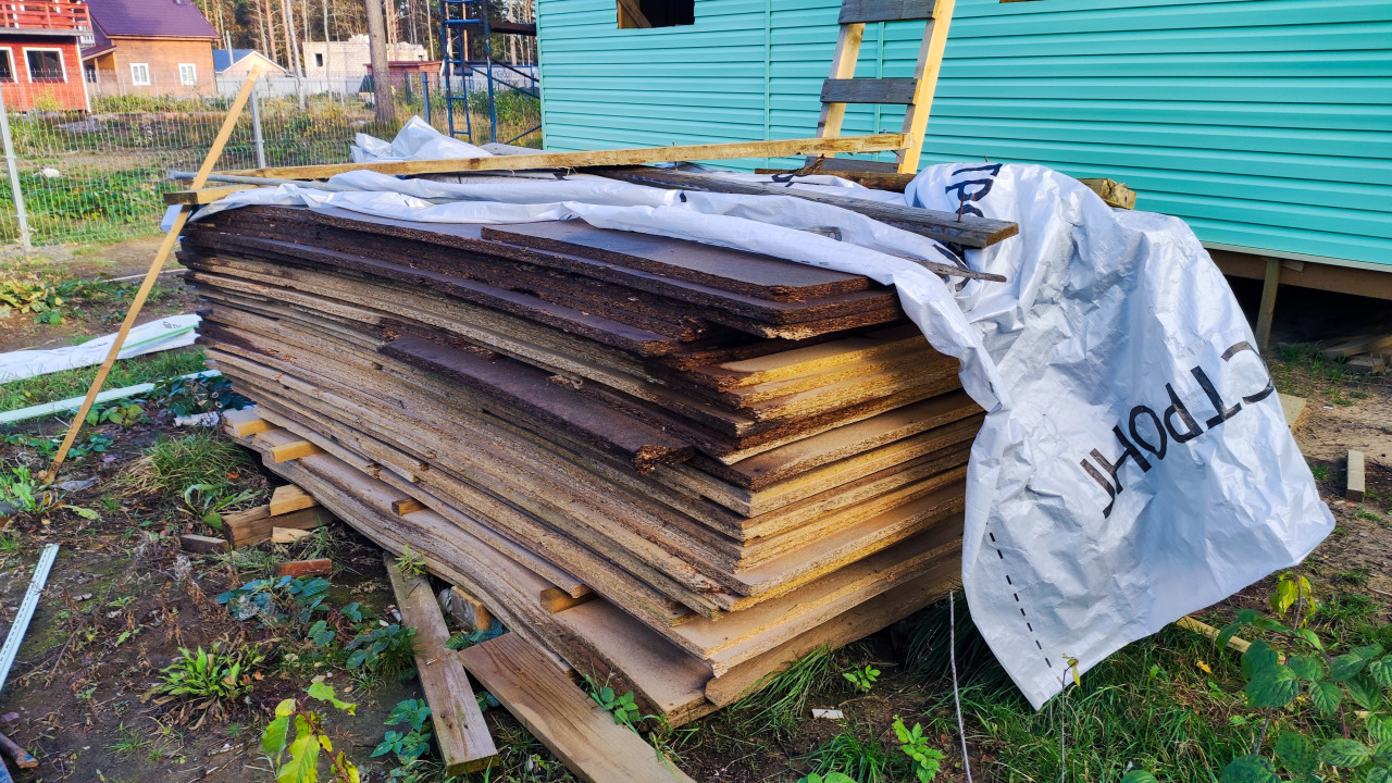 На изображении показана стопка строительных плит, аккуратно уложенных в штабель и частично накрытых полиэтиленовой плёнкой. Плиты различаются по цвету и степени износа, предположительно изготовлены из древесных волокон или ДСП. На заднем плане виден зелёный фасад строящегося дома и деревянная лестница. Место съёмки — участок с растительностью и строительным мусором, что указывает на активное ведение работ. Фотографию можно использовать в темах, связанных с хранением строительных материалов, логистикой и подготовкой площадки.