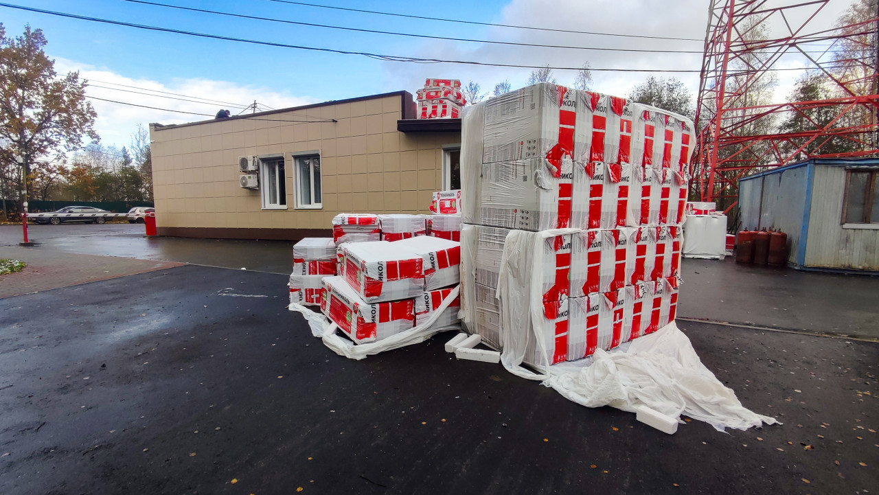 На изображении запечатлены паллеты утеплителя ТЕХНОНИКОЛЬ, размещённые на временной площадке хранения рядом с объектом перед подачей на крышу. Материал уложен штабелями и частично раскрыт для дальнейшего перемещения, что указывает на развернутый этап подготовки работ по теплоизоляции плоской кровли. На заднем плане виден фасад здания с пластиковыми окнами и установленными кондиционерами, а также опоры сотовой или радиорелейной связи, характерные для производственных или административных территорий. Фотография может использоваться для демонстрации поставки утеплителя, подготовки к монтажу и документирования этапов капитального ремонта кровли.
