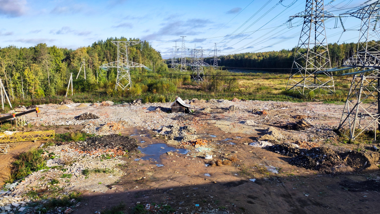 Фотография показывает участок земли, подготовленный под строительство, на котором видны кучки строительного мусора, остатки кирпича и металлоконструкции. На заднем плане проходят линии электропередачи, пересекающие поле и уходящие к горизонту. Слева в кадре виден недостроенный объект с рабочими и строительной техникой. Ландшафт окружён лесом, что подчёркивает сочетание природной и индустриальной среды. Фото можно использовать в материалах о строительстве и энергетике.