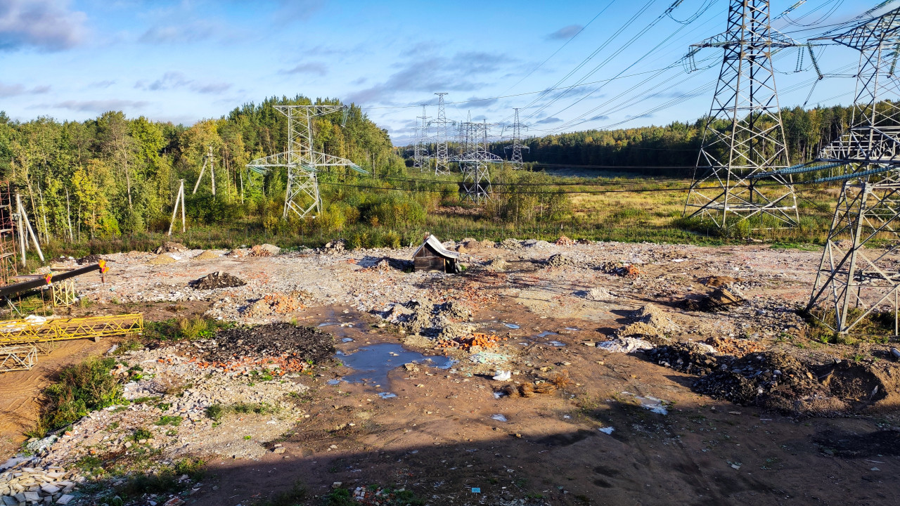 На снимке изображён строительный участок с остатками строительных материалов, фрагментами кирпича и грунта. На заднем плане видны высоковольтные линии электропередачи, уходящие через поле к горизонту. По краям кадра заметны рабочие и металлические конструкции, часть которых используется для монтажа. Местность окружена лесом, типичной для пригородной зоны. Изображение отражает процесс освоения территории и может применяться в темах о строительстве и инженерных сетях.