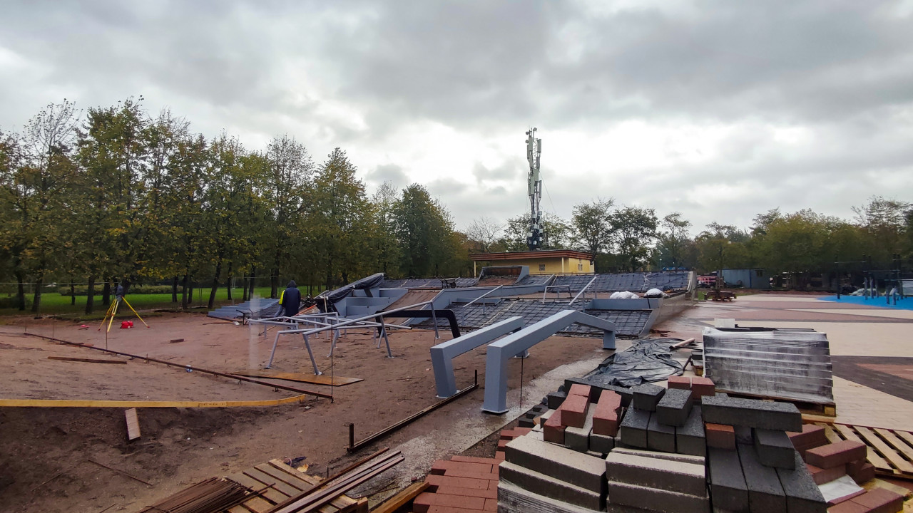 На фотографии изображён участок строительных работ с монтажом металлических каркасов и укладкой плитки. В центре кадра — рабочие, устанавливающие элементы сооружения. На переднем плане — стопки строительных блоков и брусчатки, на заднем — зелёные деревья и технические контейнеры. Атмосфера пасмурного дня с серым небом подчёркивает условия уличного строительства. Фото отражает процесс благоустройства городской территории.