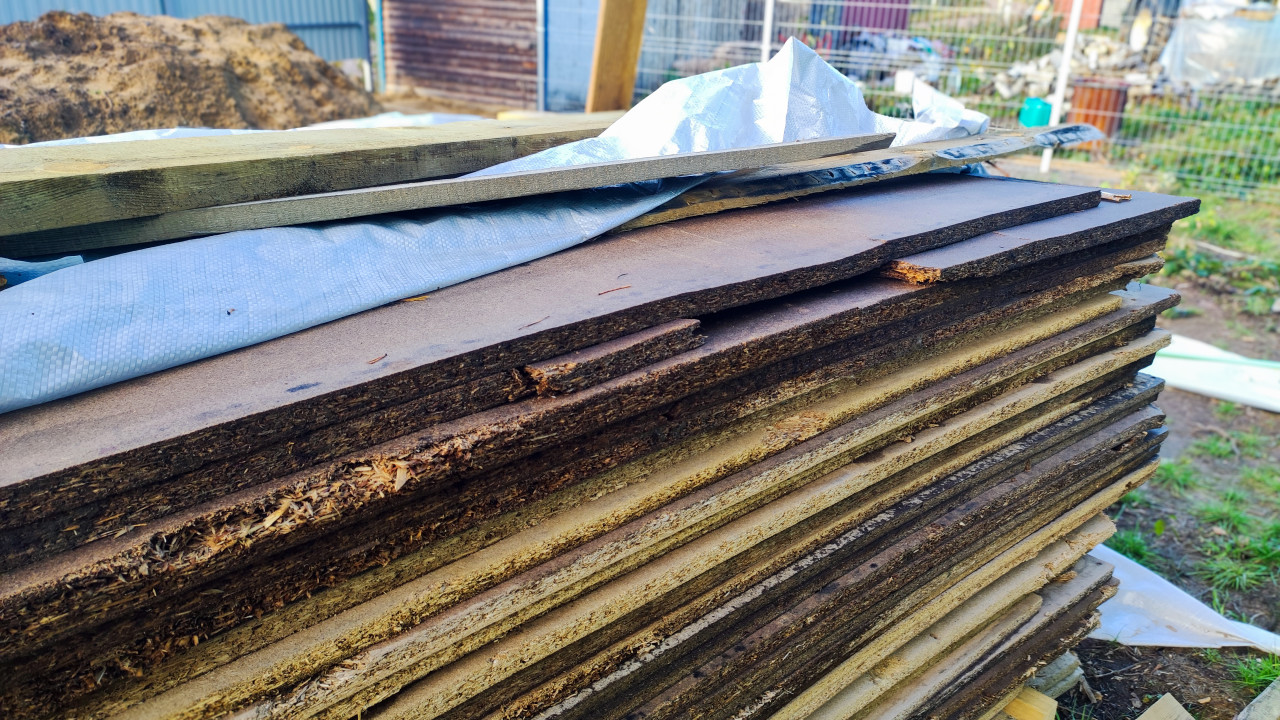 На фотографии изображены уложенные в штабель строительные плиты, предположительно ДСП, предназначенные для наружных или внутренних работ. Материалы имеют разные оттенки коричневого, а на их поверхности видны следы распила и эксплуатации. На верхней части штабеля лежат деревянные доски и защитная плёнка. Фон составляют ограждение участка, грунт и хозяйственные постройки. Снимок может использоваться в темах, связанных с хранением и подготовкой стройматериалов, строительной логистикой, а также технологией деревянного домостроения.