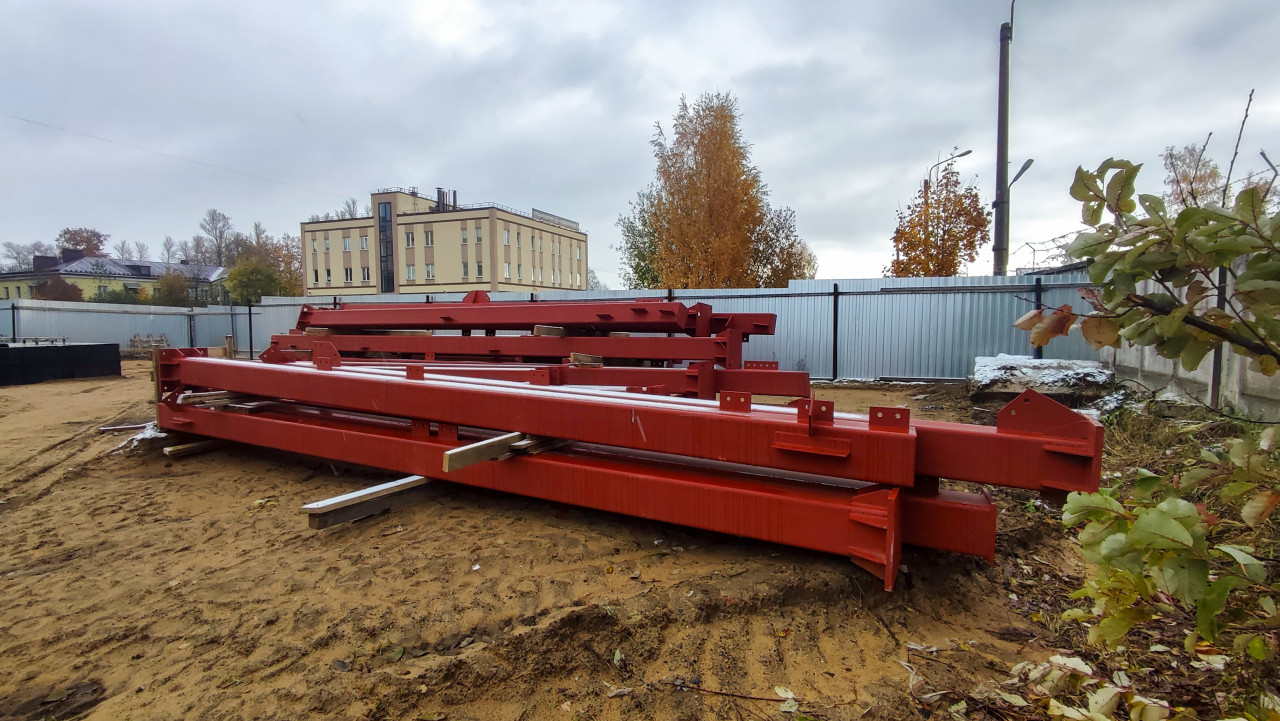 Снимок демонстрирует металлические балки и колонны будущего несущего каркаса котельной, размещённые на участке стройплощадки перед началом монтажных работ. Конструкции уложены штабелем на подкладки, что предотвращает деформацию и коррозионный контакт с грунтом. На заднем плане видно здание действующего объекта инфраструктуры и строительное ограждение, что подтверждает производственный характер площадки. Такие изображения могут быть использованы в тематических материалах о строительстве энергоузлов, этапах монтажа металлоконструкций и логистике промышленных объектов.