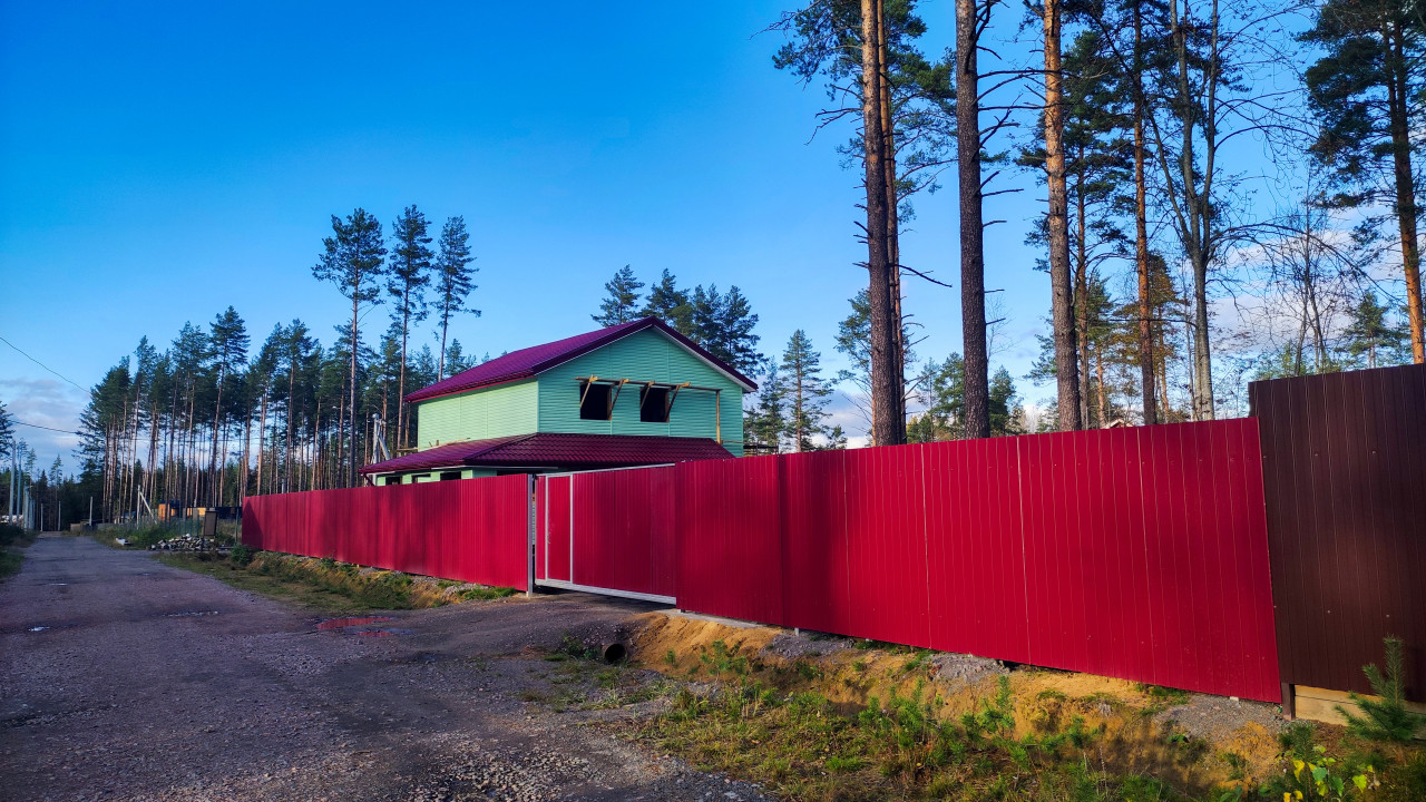 На фото изображён частный загородный дом с красной металлической кровлей и фасадом салатового цвета, окружённый высоким забором из красного профнастила. Дом расположен на краю соснового массива, вдоль грунтовой дороги. В кадре видны столбы электропередач и ровная линия забора, указывающая на недавно завершённое строительство. Сцена характерна для современных дачных посёлков Ленинградской области или северо-западной России. Фотография может быть использована в статьях и каталогах о загородной недвижимости, строительстве домов и благоустройстве участков.