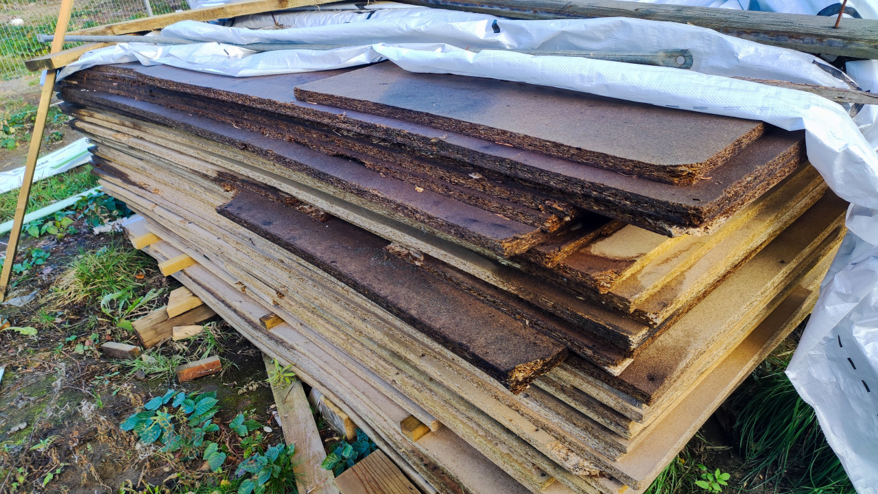 На снимке показана стопка плитных строительных материалов, предположительно из древесно-стружечной плиты (ДСП), размещённая на участке рядом со строящимся домом. Поверх штабеля лежит защитная белая плёнка, а рядом — деревянные рейки и элементы опалубки. Материалы имеют следы эксплуатации и разную толщину. Фон составляют зелёный фасад здания и забор, отделяющий территорию. Изображение можно использовать для иллюстрации тем о хранении, повторном использовании или переработке строительных материалов.