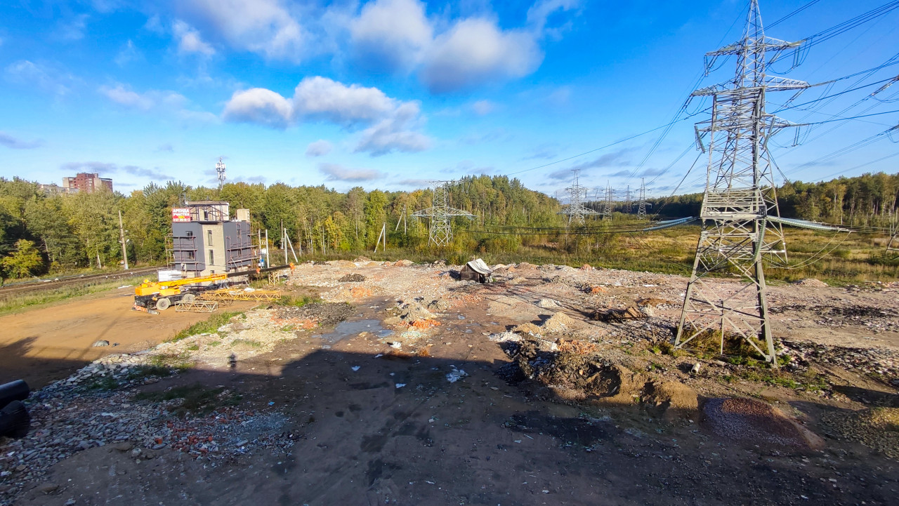 На фотографии изображён участок земли с элементами строительных работ, строительным мусором и металлическими конструкциями. На заднем плане — ряды высоковольтных опор, уходящих вдоль поля в сторону леса. Слева в кадре заметно недостроенное здание и рабочие. Снимок сделан в ясную погоду, демонстрируя современную инженерную инфраструктуру и освоение промышленных территорий. Подходит для тематик, связанных с энергетикой, строительством и развитием территорий.