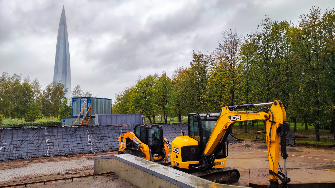 На фотографии показана строительная площадка с двумя экскаваторами марок JCB и CASE, припаркованными рядом с временными контейнерами. На заднем плане виден небоскрёб Лахта-центр — самое высокое здание Европы, расположенное в Санкт-Петербурге. Поверхность площадки влажная после дождя, окружение составляют зелёные деревья и серое осеннее небо. Снимок отражает этап работ по благоустройству городской территории с применением современной спецтехники и может использоваться для иллюстрации тем строительства, урбанистики и развития инфраструктуры.