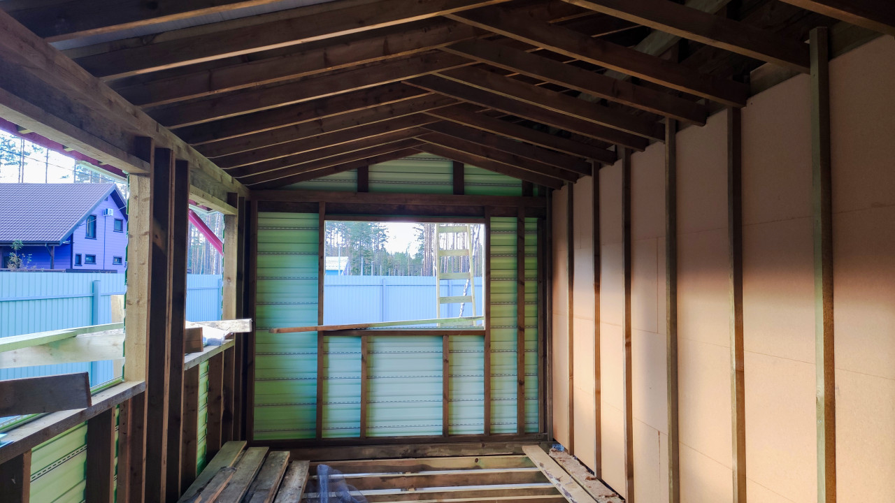 На изображении показан деревянный каркас строящегося здания с открытыми стропилами и несущими элементами. В стенах установлены панели и обшивка из листовых материалов, часть конструкции ещё не закрыта. Через оконный проём виден забор и участок с соседними домами. Такое строение характерно для каркасных домов, возводимых в частном секторе. Фотография иллюстрирует этап строительства до установки внутренней изоляции и внешней отделки, и может быть использована в статьях о технологиях каркасного домостроения, монтаже кровельной и стеновой изоляции.