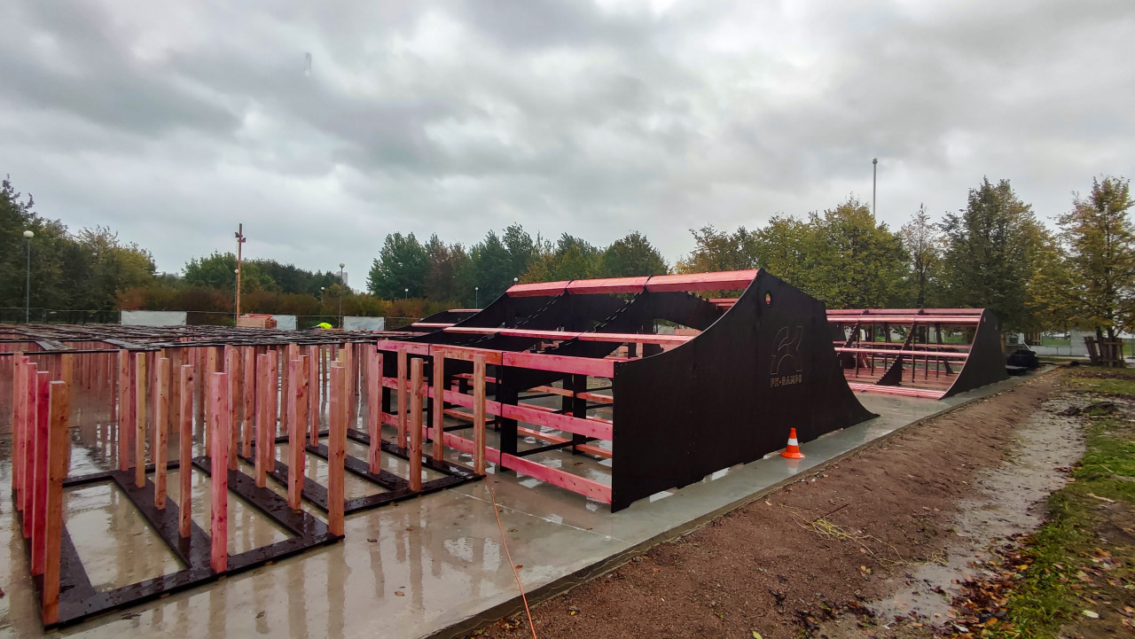 На фотографии изображён процесс монтажа деревянной конструкции рампы на бетонном основании будущего скейт-парка. Используются окрашенные в розовый цвет деревянные балки и чёрные фанерные панели, формирующие основу для последующей отделки покрытия. На площадке видны следы дождя, что указывает на осенние погодные условия. Снимок можно использовать в материалах о строительстве спортивных сооружений, урбанистике и благоустройстве городской среды.